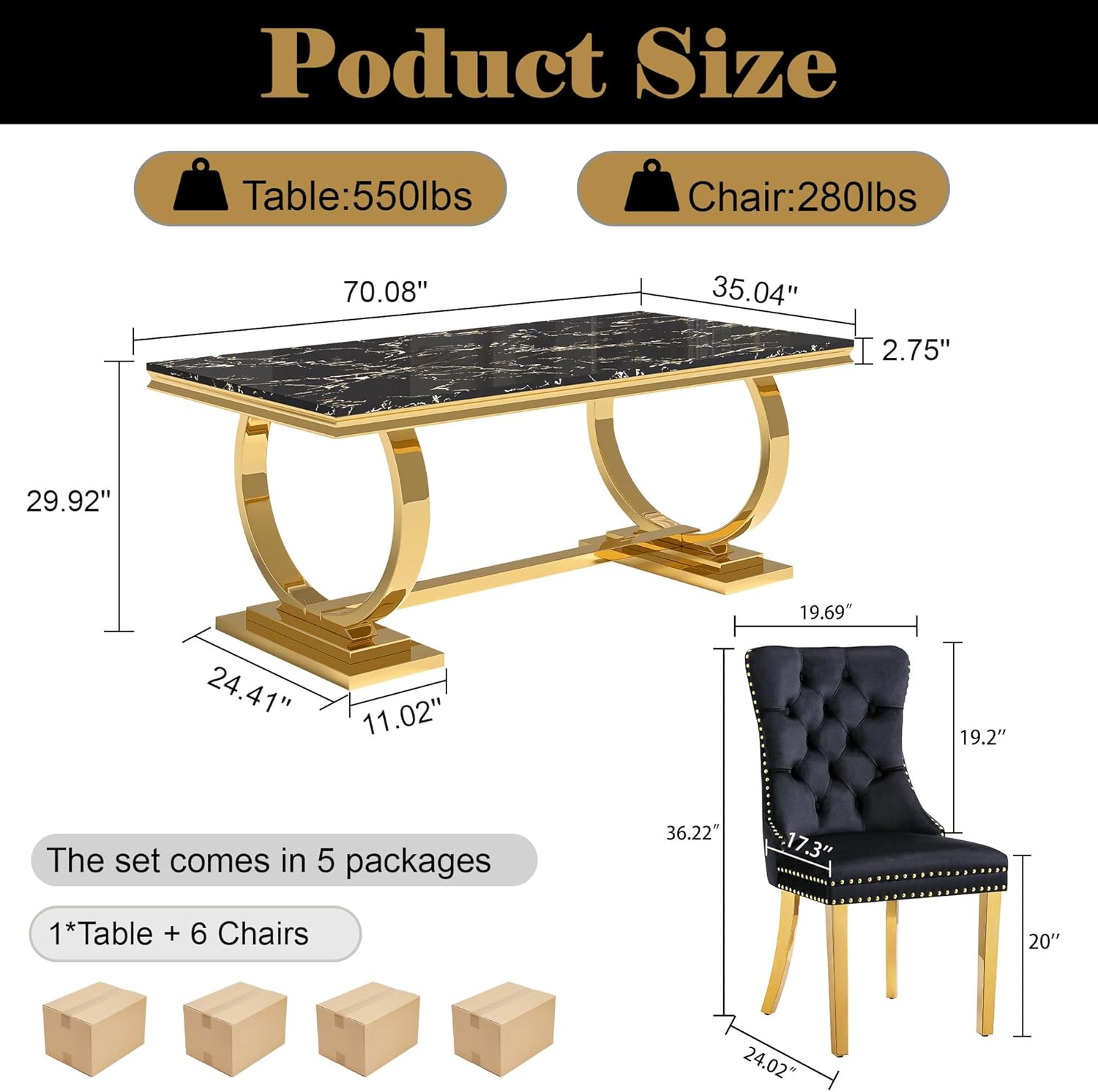 The Marble Dining Table Set for 6 delivers a refined dining experience through its harmonious blend of luxury, comfort, and modern aesthetics. This sophisticated 7-piece ensemble features a generously sized table crafted from high-quality faux marble in a sleek black finish, paired with six elegantly upholstered velvet chairs. Each chair is designed with both style and ergonomics in mind, offering generous seating space without compromising on visual appeal. Supported by polished gold stainless steel legs, the entire set exudes elegance while maintaining exceptional stability. Ideal for formal dinners, casual family meals, or entertaining guests, this dining set transforms any dining area into a statement of contemporary sophistication.