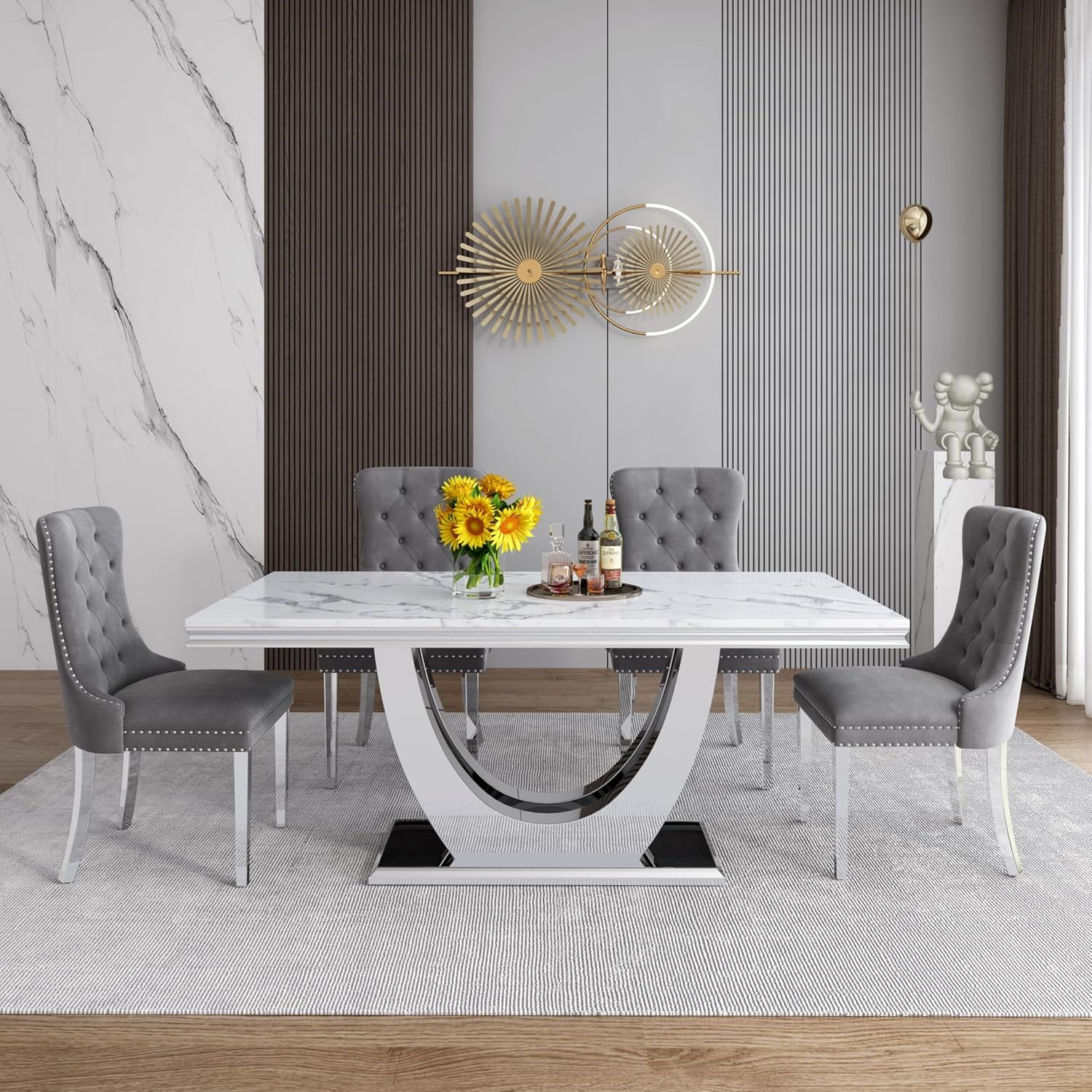 This dining set is thoughtfully designed for homeowners, renters, and interior designers seeking a stylish yet practical solution for medium to large dining spaces. The large table size makes it particularly well-suited for families who frequently entertain guests or enjoy long communal meals. The lightweight yet durable faux marble top resists chipping, cracking, and staining, ensuring the set retains its beauty through years of regular use. Easy to clean and maintain, it requires only occasional dusting and gentle wiping with a damp cloth to preserve its glossy finish.