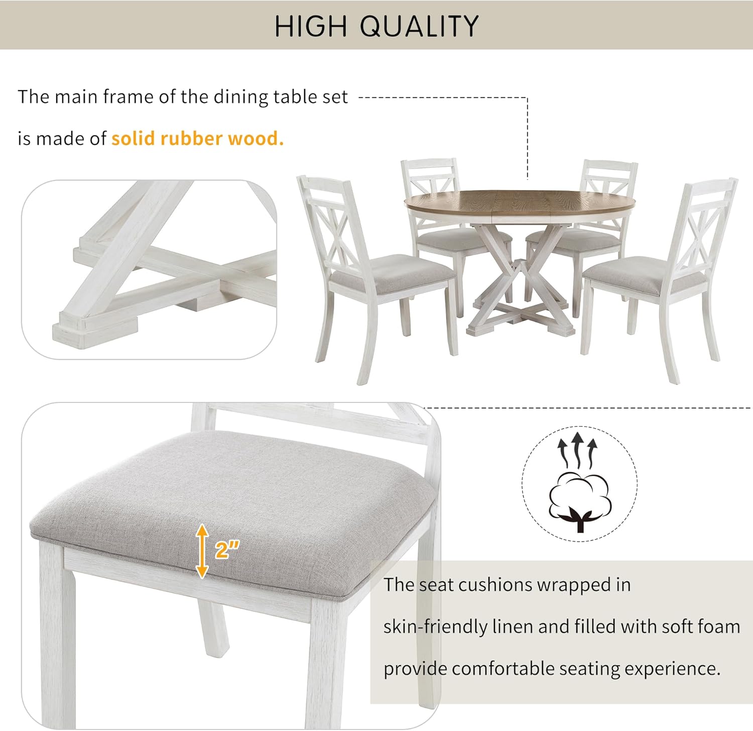 - Durable & Sturdy Build: Constructed with high-quality materials, the tabletop and apron are made from MDF (medium-density fiberboard) for a smooth, stable surface, while the base and chair frames are crafted from robust rubber wood, known for its strength and resistance to warping. This hybrid material approach ensures longevity and reliable daily use.