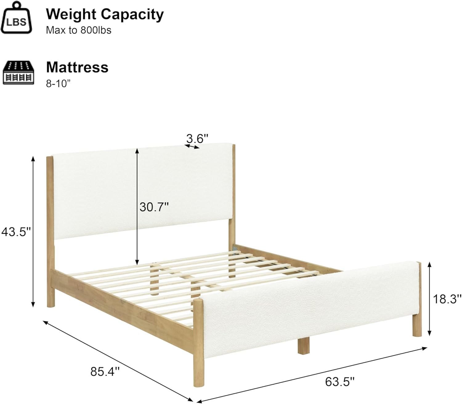 • Matching Headboard and Footboard: Both components are fully upholstered in the same premium boucle material, creating a cohesive look from top to bottom and offering functional support for reading or lounging.