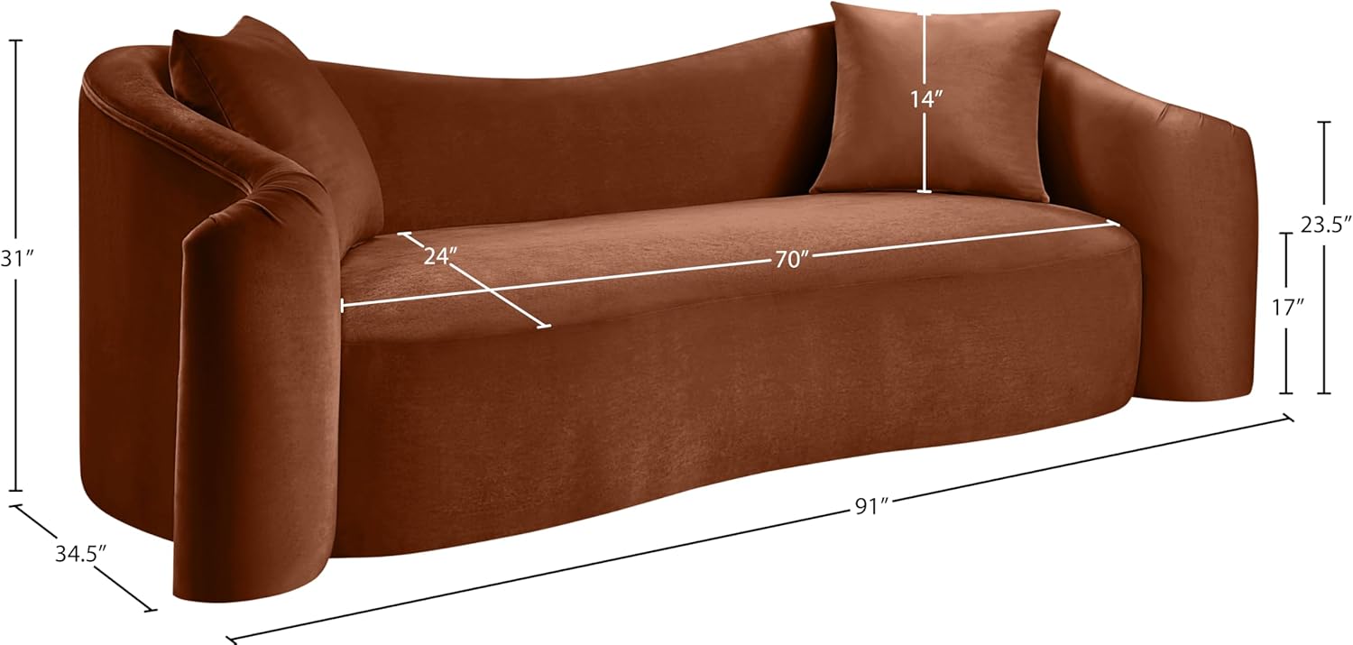 The Meridian Furniture Destin Collection Modern Sofa redefines contemporary luxury with its bold, sculptural silhouette and sumptuous cognac velvet upholstery. Designed for discerning homeowners and interior designers alike, this 91-inch wide sofa combines striking organic curves with ultra-plush comfort, creating a statement piece that elevates any modern living space. As part of the exclusive Destin Collection, each element—from the rich fabric to the carefully engineered frame—has been crafted to deliver both visual impact and lasting durability. Whether placed in a formal living room, a boutique lounge, or a high-end hospitality setting, this sofa commands attention while offering the relaxation expected of a premium seating experience.