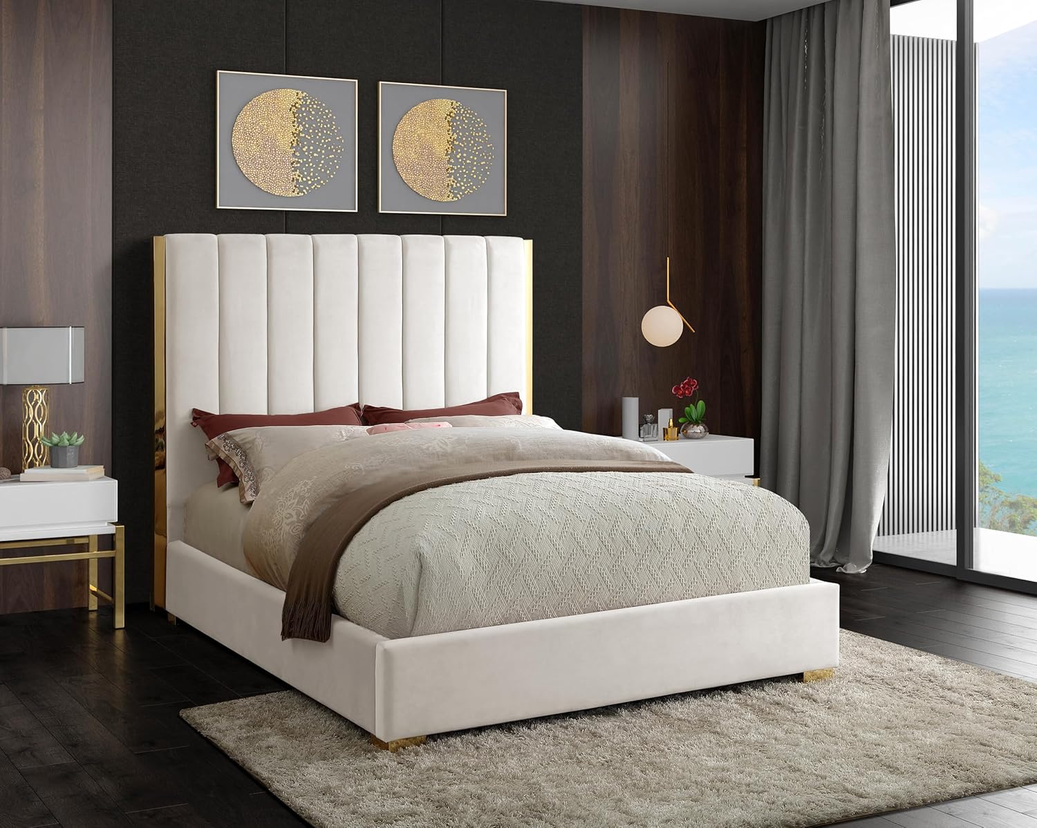 Transform your bedroom into a luxurious retreat with the Meridian Furniture Becca Collection king bed. Designed to blend opulence and modern elegance, this statement piece combines sumptuous cream velvet upholstery with striking polished gold metal framing. The deep channel tufting across the headboard not only adds visual depth but also reinforces structural integrity, creating a refined silhouette that elevates any contemporary space. Whether you’re furnishing a master suite or updating a guest room, this bed delivers both aesthetic impact and everyday comfort.
