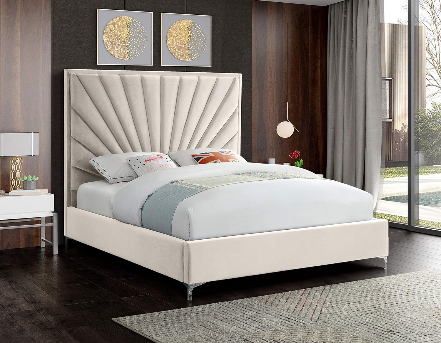 Elevate your bedroom with the striking presence of the Meridian Furniture Eclipse Collection Queen Bed. This modern centerpiece combines luxurious cream-colored velvet upholstery with a meticulously crafted channel-tufted headboard that radiates sophistication and architectural detail. The fan-like shell pattern creates depth and visual rhythm, transforming a simple bed into a statement piece that defines contemporary elegance. Designed for discerning homeowners who value both form and function, this queen-sized platform bed delivers refined style without compromising on comfort or practicality.