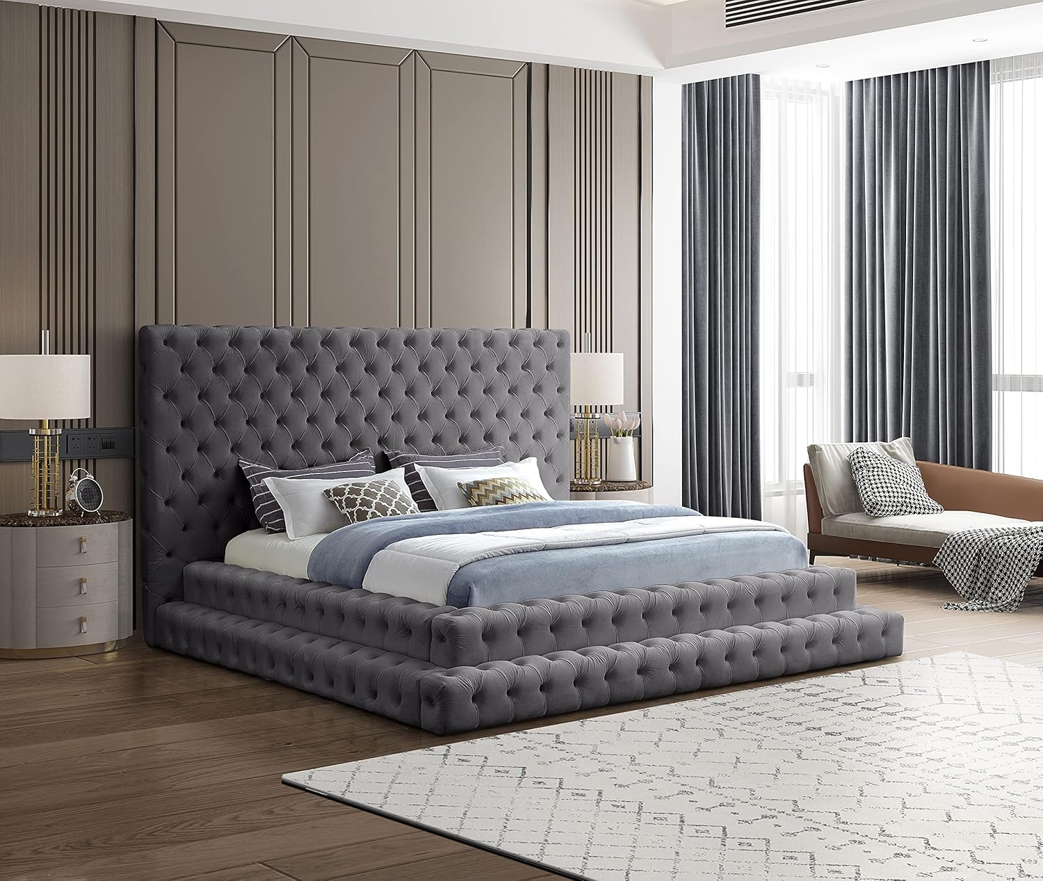 Measuring 101 inches wide by 98 inches long and standing at an impressive 60 inches high, this bed offers generous space for two adults to rest comfortably. Its commanding presence makes it perfect not only for master bedrooms but also for stylish guest rooms or upscale vacation rentals where first impressions matter most. Whether paired with minimalist decor or layered textures in a bohemian-inspired setting, the neutral grey hue ensures seamless integration into a variety of interior themes.