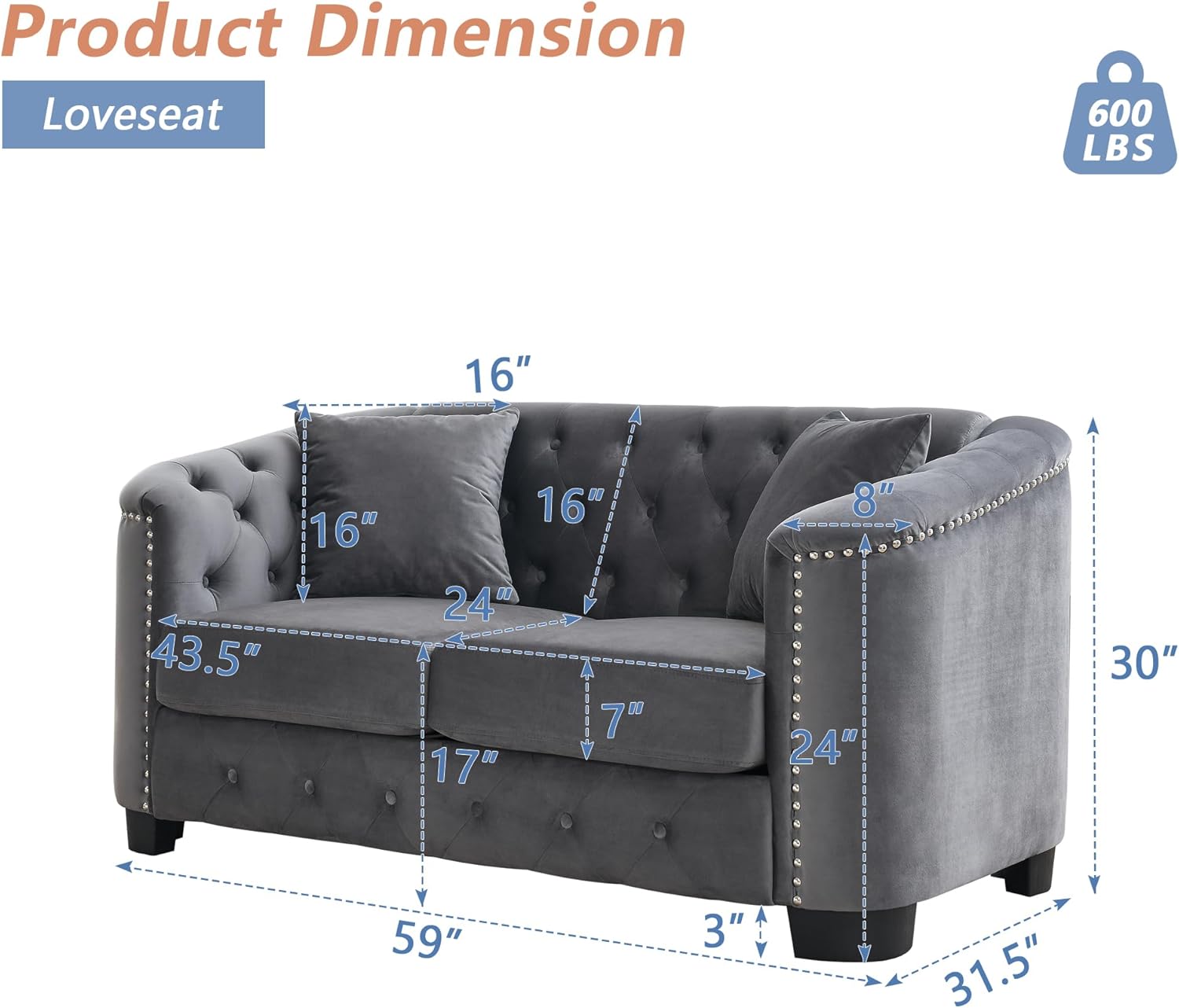 Please note that this product ships as a single loveseat unit. Depending on the delivery configuration, assembly may be required—review packaging contents upon arrival for instructions. To preserve the appearance and texture of the velvet fabric, avoid prolonged exposure to direct sunlight and clean spills promptly with a dry cloth. For regular maintenance, gentle vacuuming or spot cleaning is recommended. Always adhere to the stated weight limit of 300 lbs per seat to ensure safety and optimal performance. The hard plastic feet are designed to prevent floor damage; however, placing felt pads underneath may further protect sensitive surfaces such as hardwood or tile.