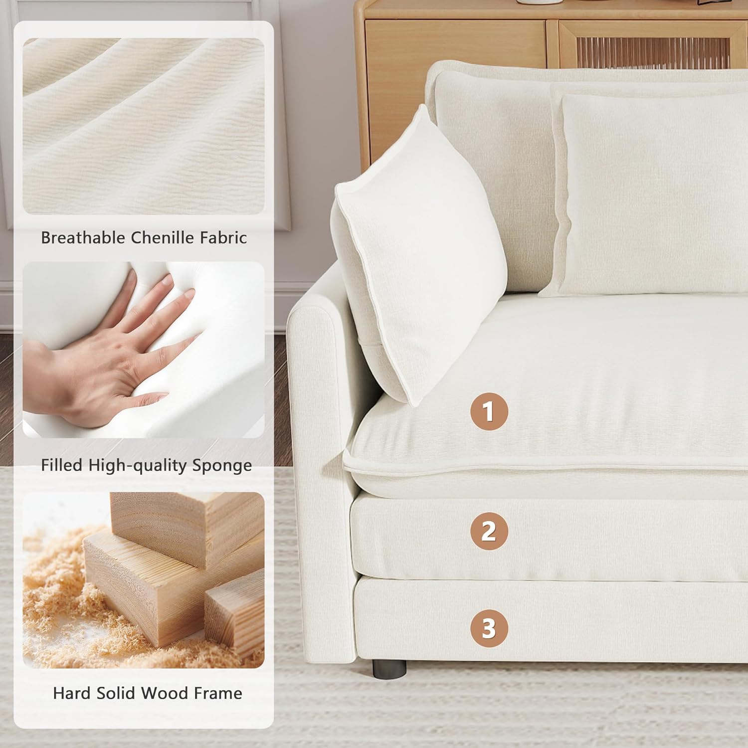 Superior Comfort: Upholstered in high-end breathable chenille fabric and filled with high-quality sponge, the sofa features thickened foam at both the backrest and seat for prime relaxation. Lean back and stretch out your legs on the ottoman when you or your guests need extra space.