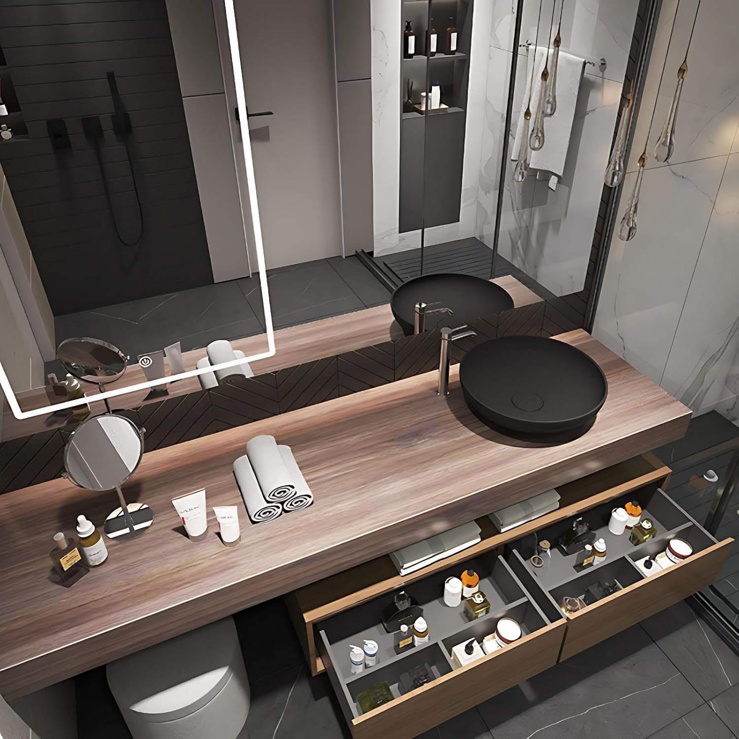 - Ceramic Vessel Sink or Seamless Stone Basin: Choose between two premium sink options—ceramic for its classic resistance to stains and ease of cleaning, or stone for a sophisticated, monolithic look that blends directly with the cabinet edges for a seamless appearance.