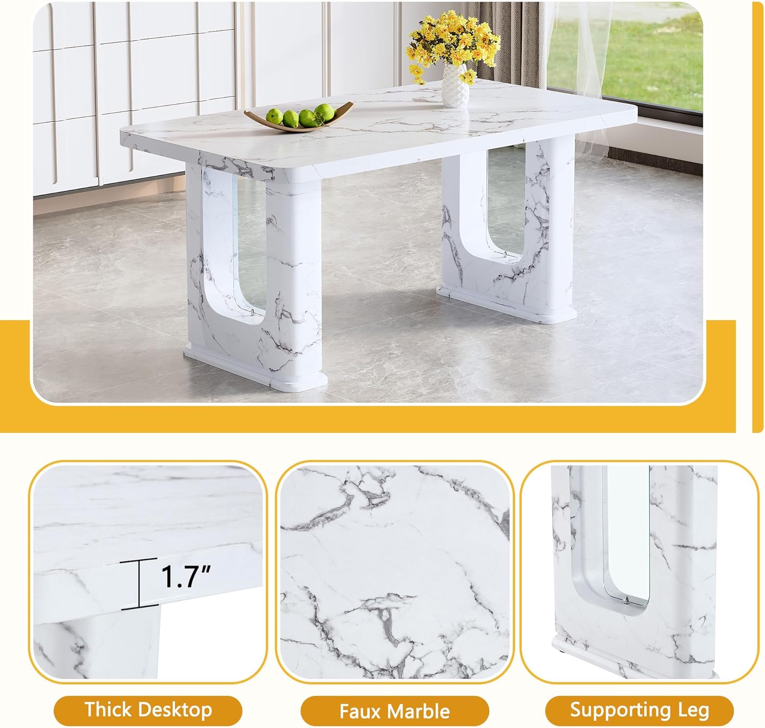 • Tabletop Material: White faux marble finish with realistic veining pattern