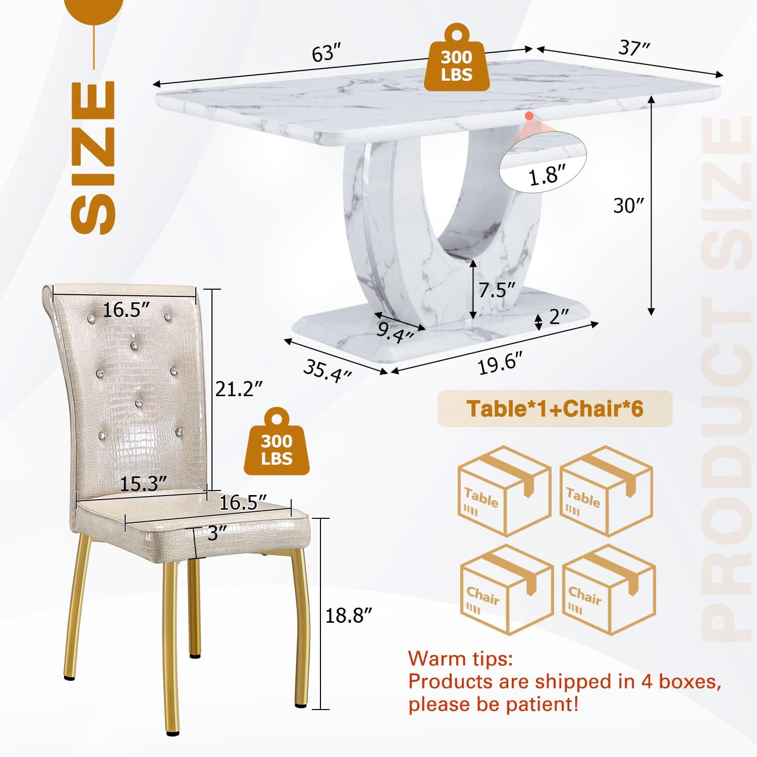 To preserve the beauty and longevity of your dining set, proper care is essential. The faux marble surface is durable but should be cleaned with a soft, non-abrasive cloth and mild cleaner to avoid scratching or dulling the glossy finish. Avoid placing hot cookware directly onto the tabletop, as excessive heat may cause discoloration or damage. For spills, wipe immediately with a damp cloth to prevent staining.