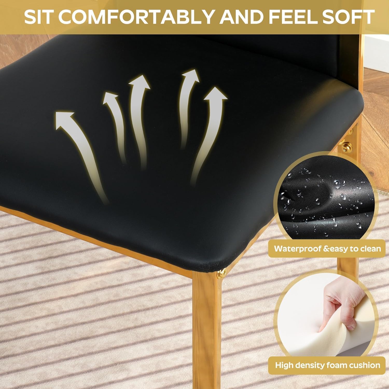 - Chair Frame & Upholstery: Black fabric seats with gold-colored metal legs