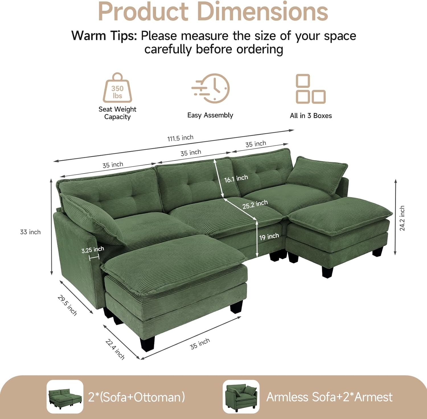 Modular Sectional Sofa, 111.5″ U-Shaped Corduroy Comfy