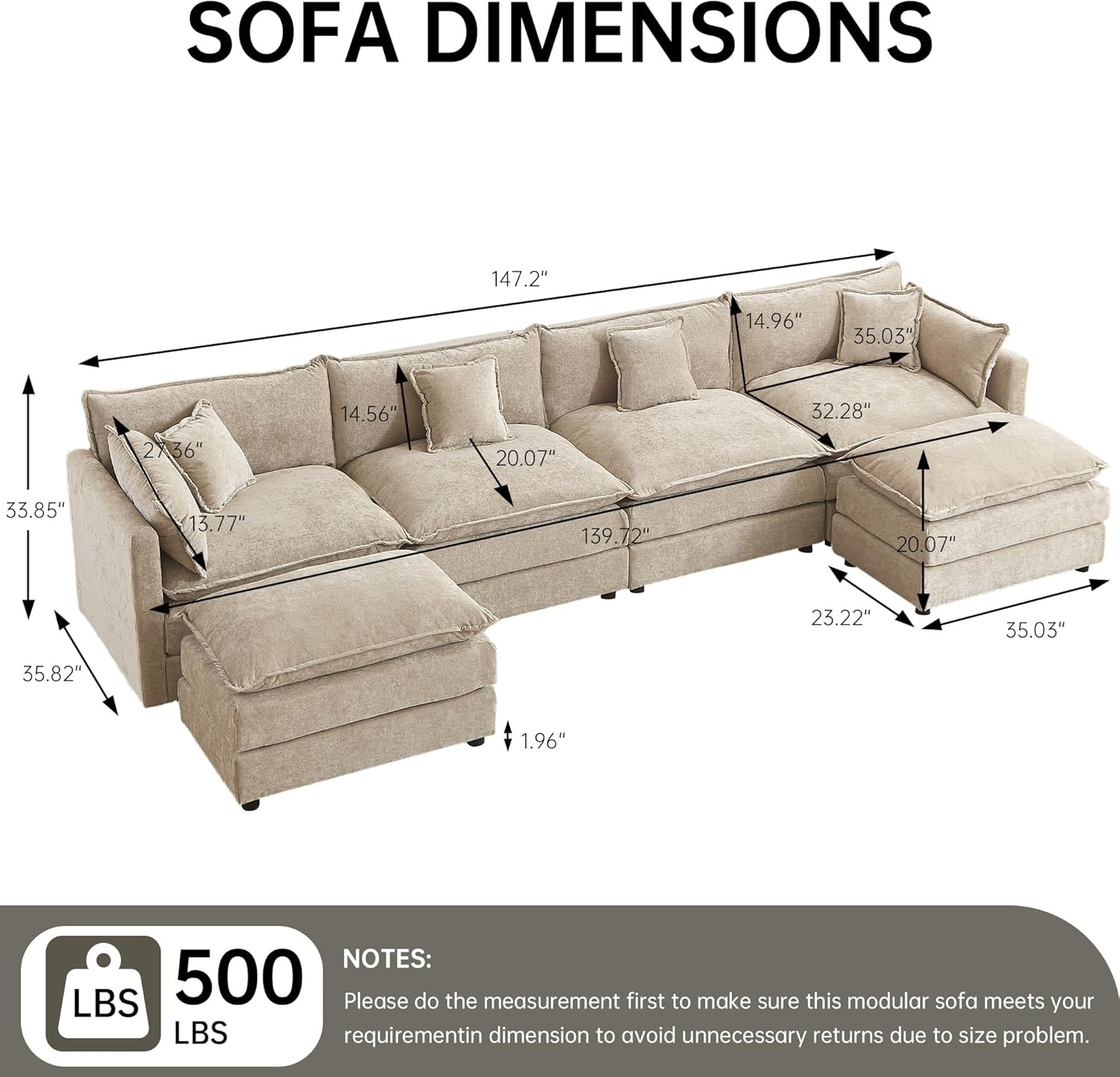 This modular U-shaped sectional sofa offers a generous and adaptable seating solution designed for modern living rooms, family spaces, and compact apartments. With a total length of 147.2 inches, it comfortably seats up to four people, making it an ideal centerpiece for entertaining guests or enjoying quiet evenings at home. The included movable ottoman adds versatility, while integrated pillow armrests enhance both comfort and style. Constructed with premium chenille fabric and high-resiliency foam cushions, this couch delivers a luxuriously soft, cloud-like experience that supports relaxation without compromising durability.