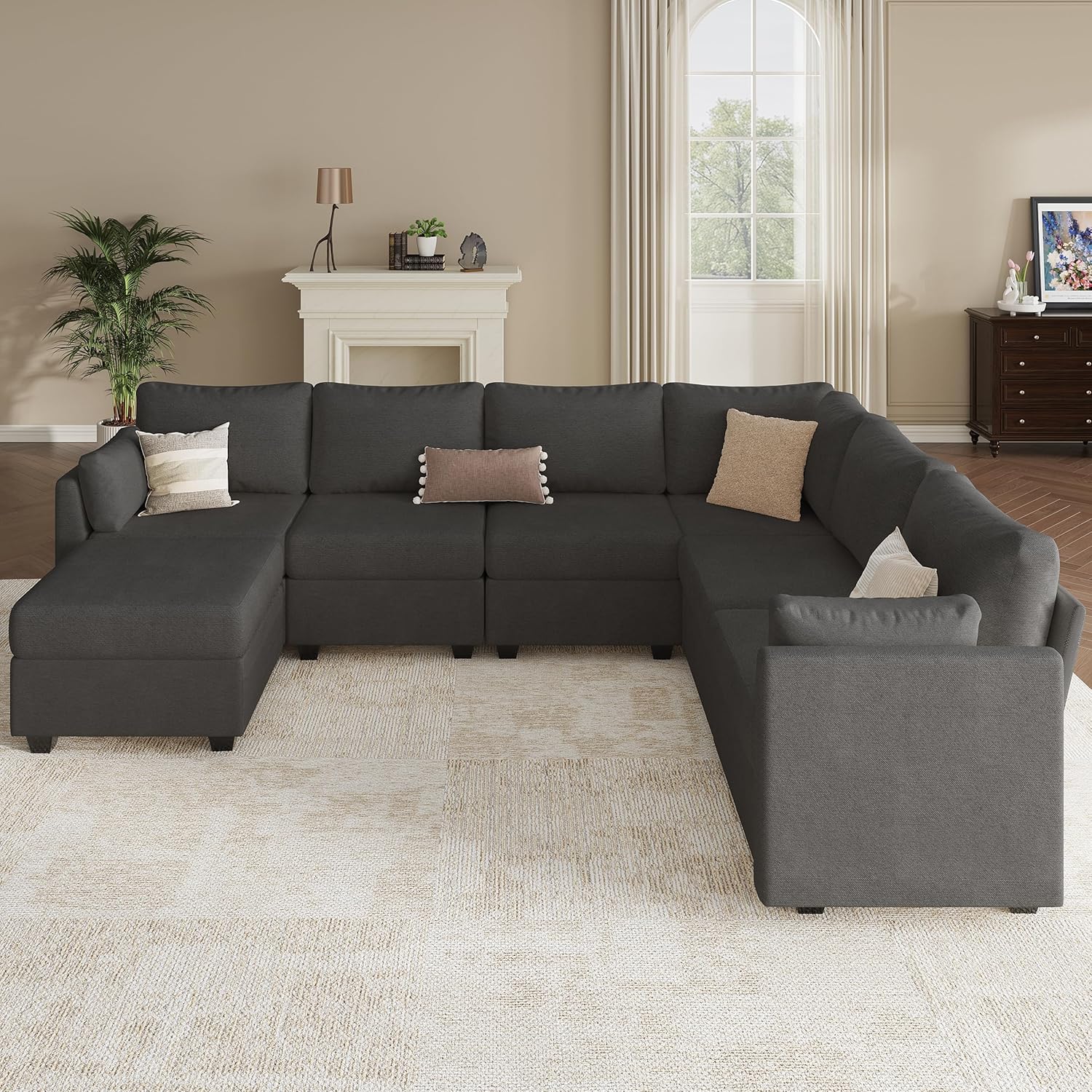 This U-shaped modular sectional sofa is engineered for spacious living environments, offering a flexible and comfortable seating solution ideal for families, social gatherings, or everyday relaxation. Designed as a 7-seater convertible couch with integrated storage, it seamlessly blends style and function—doubling as both a lounge area and a sleeper bed when needed. The sophisticated dark grey upholstery not only complements modern interiors but also ensures long-lasting durability and easy maintenance. With its modular construction and inclusion of an ottoman, this sectional adapts effortlessly to various room layouts and evolving lifestyle needs.