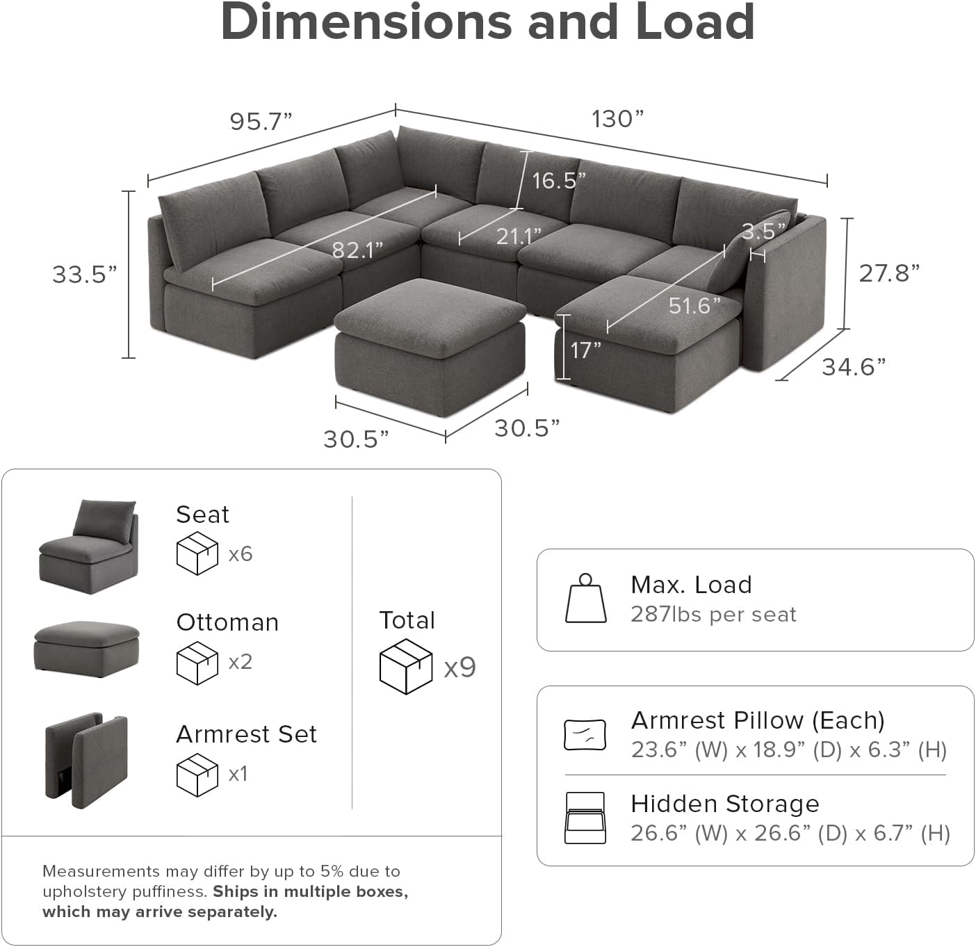 I’m really impressed with this macy sofa! The order arrived quickly—within just a few days—and was packaged securely in 5 separate boxes. The packaging was sturdy and well-organized. Three of the boxes contained the armless storage modules, one box had the armrest set, and the last box held the ottoman. I really appreciated how well everything was packed, especially the cushions, covers, and hardware, all of which were safely stored inside the sofa itself to prevent damage.Putting the sofa together was a breeze. The instructions were clear and easy to follow, and I was able to assemble it myself without any trouble. The design is sleek, modern, and fits perfectly in my living room. I also love the Velcro strips that keep the seat cushions securely in place. With dogs in the house, this is a huge plus—there’s no worry of the cushions sliding off or being pulled out when the dogs jump on or off the sofa, or when I lift the lid to access the storage space.The fabric feels durable and is easy to maintain—the color also hides dog hair really well! The cushions are comfortable yet provide great support. The storage compartments are fantastic for keeping blankets, cushions, dog toys, and even exercise equipment out of sight. This has really helped clear up some clutter in my living space.Overall, I’m really happy with this purchase. The combination of comfort, design, and smart storage solutions makes it a great addition to any home! Highly recommend!