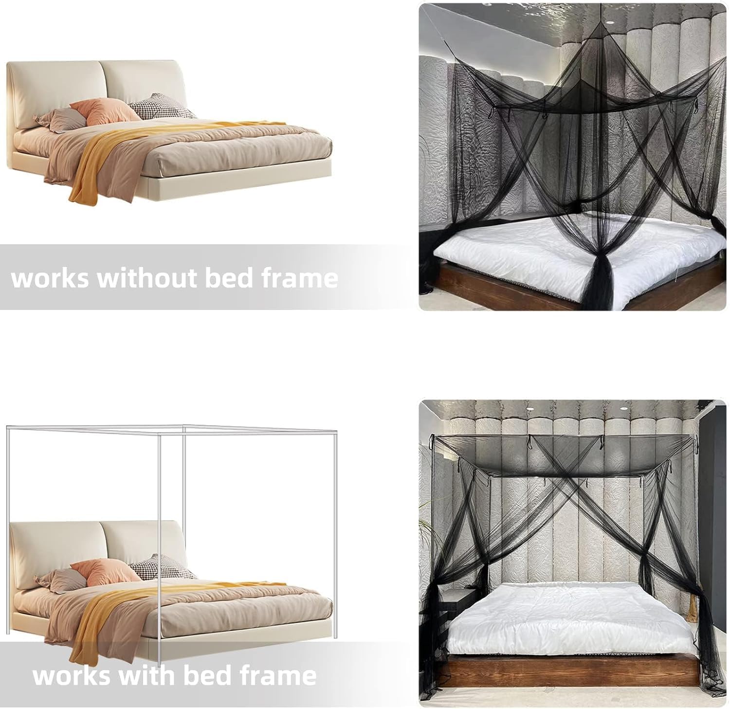 • Elegant Black Netting: Made from durable, fine-weave mesh in a sleek black color, the netting effectively repels mosquitoes, flies, and other flying insects while contributing a modern, refined look to your bedroom decor.