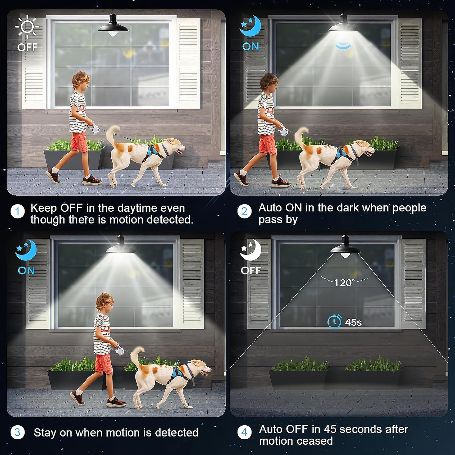 - Wide Detection Angle: Features a 120-degree sensing range, allowing it to detect movement from multiple directions around the fixture.
