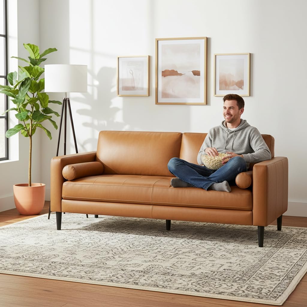 The neutral tan finish allows homeowners to experiment with textiles, lighting, and artwork without worrying about color clashes. Pair it with navy throw pillows for contrast, layer in jute rugs for texture, or keep it minimal with black metal accents for a monochrome look. Because genuine leather naturally breathes and molds to use, the sofa forms a personalized embrace over time, becoming uniquely yours through daily interaction.