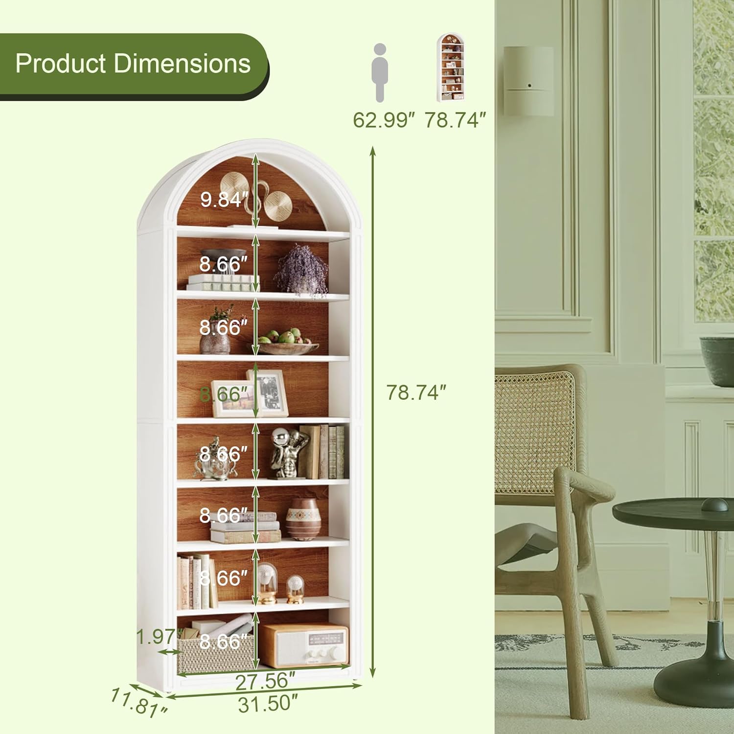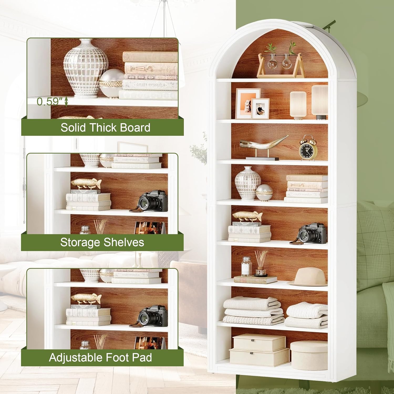 Elegant Arched Design:This high-end arched bookshelf adds a stylish, sophisticated touch to any room, elevating your home’s décor with its unique, visually appealing shape.