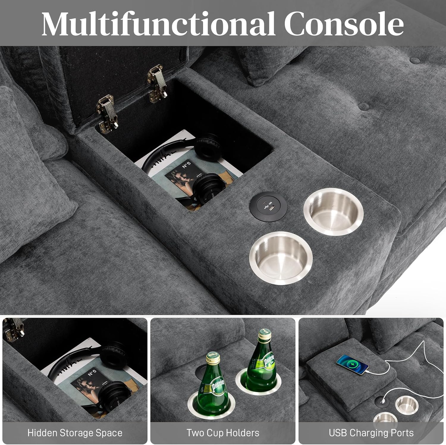 - Built-In Central Console with Cup Holders & USB Port: Stay organized and connected with dual cup holders, a hidden storage compartment, and a built-in USB port—ideal for keeping devices charged while relaxing.