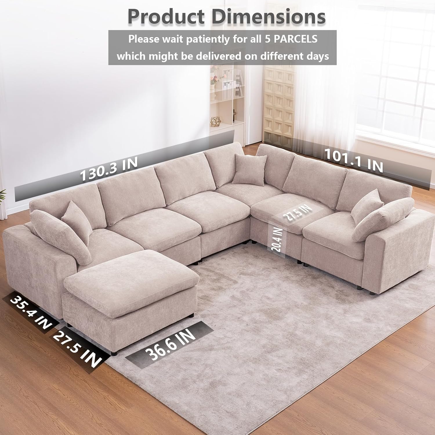 This oversized modular sectional sofa redefines comfort and flexibility for modern living spaces. Designed with a spacious U-shaped layout, it comfortably seats up to seven people, making it an ideal centerpiece for family gatherings, movie nights, or casual socializing. The neutral beige chenille fabric offers a soft, inviting texture that complements both contemporary and traditional interiors while remaining durable enough for everyday use. What truly sets this sofa apart is its modular construction—each piece can be easily disassembled and rearranged, allowing you to adapt the couch’s shape to fit your room’s dimensions or evolving lifestyle needs. Whether used in a large living room, office lounge, or open-concept home office, this sectional blends functionality with stylish design.