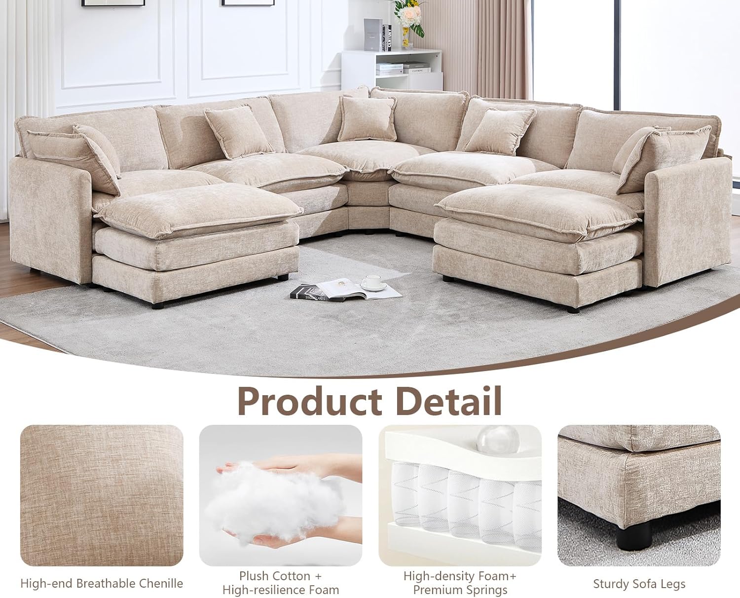 • Oversized Modular Design: The versatile U-shaped layout includes multiple modules and an included ottoman, offering flexible arrangements that adapt to any room configuration—perfect for small spaces or expansive areas.