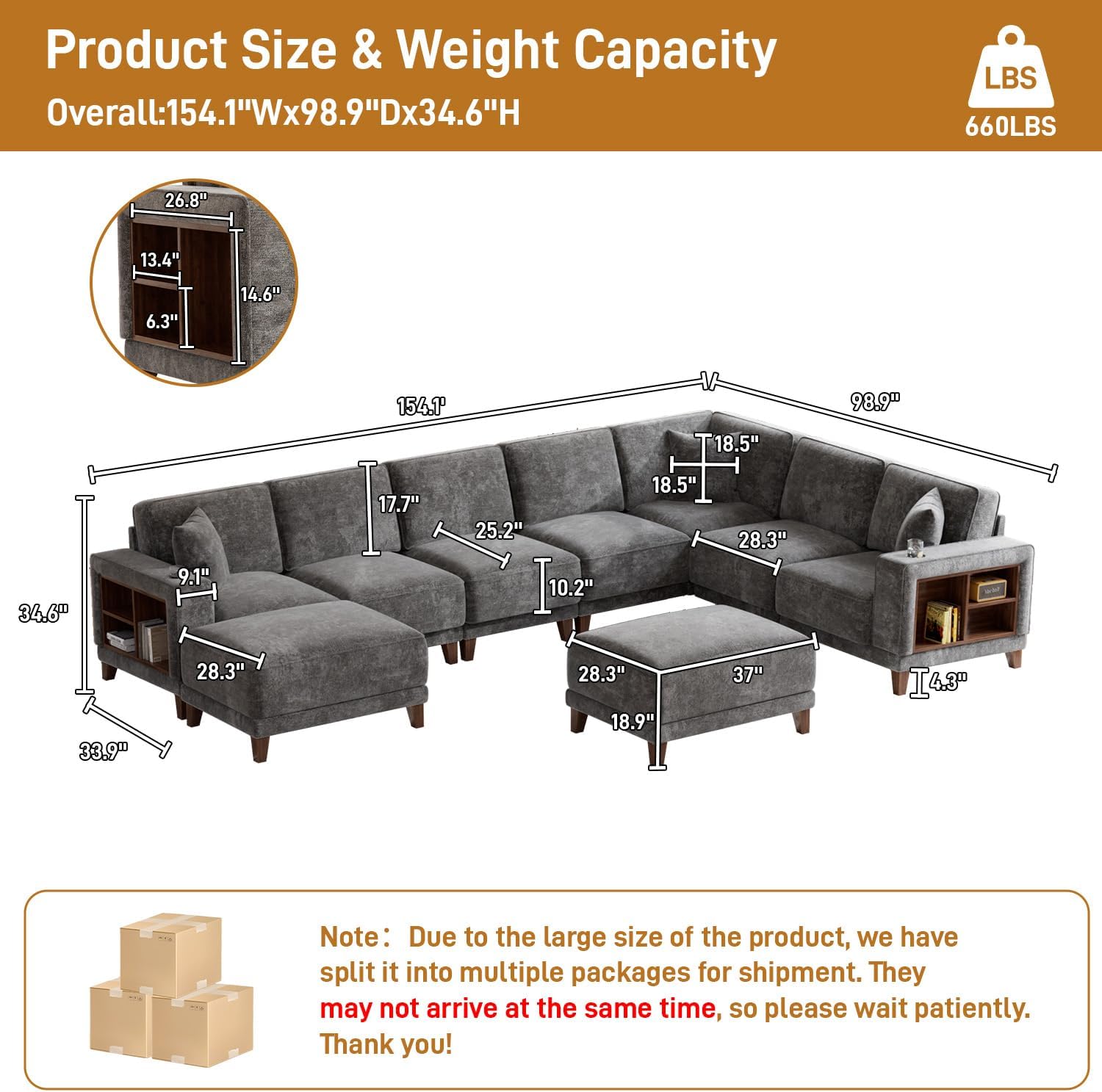 This oversized modular sectional sofa delivers a luxurious 9-seat configuration designed for modern living rooms that value both space and style. Crafted with deep seating, it offers exceptional comfort whether you’re hosting guests or simply unwinding at home. The U-shaped layout includes a 2+3 base configuration plus an included ottoman, providing flexible arrangement options to suit your floor plan and social needs. Built into each armrest are practical features such as USB charging ports, hidden cup holders, and discreet side storage cabinets—making this more than just furniture; it’s a complete entertainment hub. Constructed from soft yet durable chenille fabric in a timeless dark grey hue, the sofa blends aesthetic elegance with everyday resilience, ensuring it remains a centerpiece in your home for years to come.