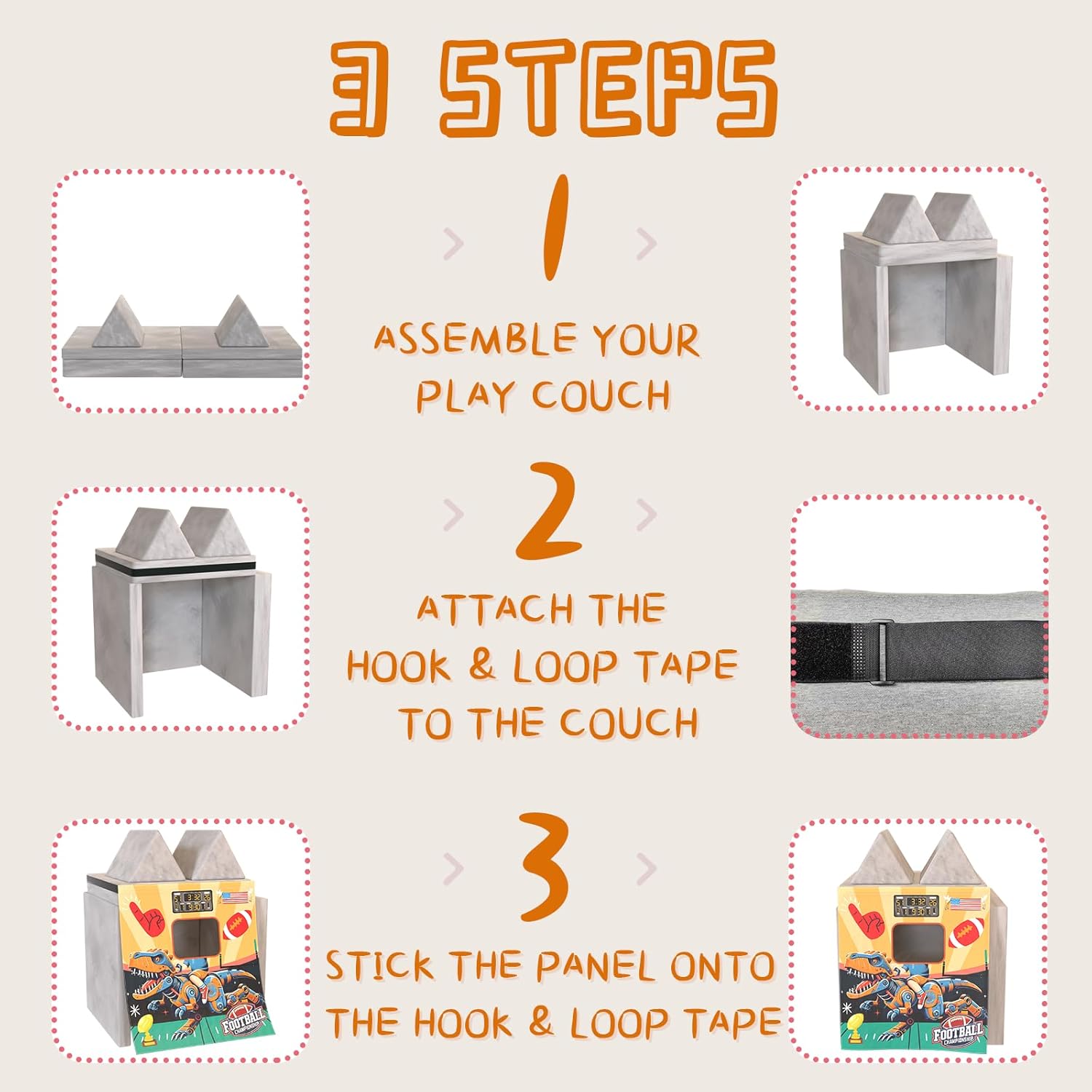 Effortless Setup, Endless Fun: With the included 12-foot hook-and-loop tape, installation is a breeze on any play couch or suitable furniture. Switching themes is quick and easy, keeping the excitement fresh and new.