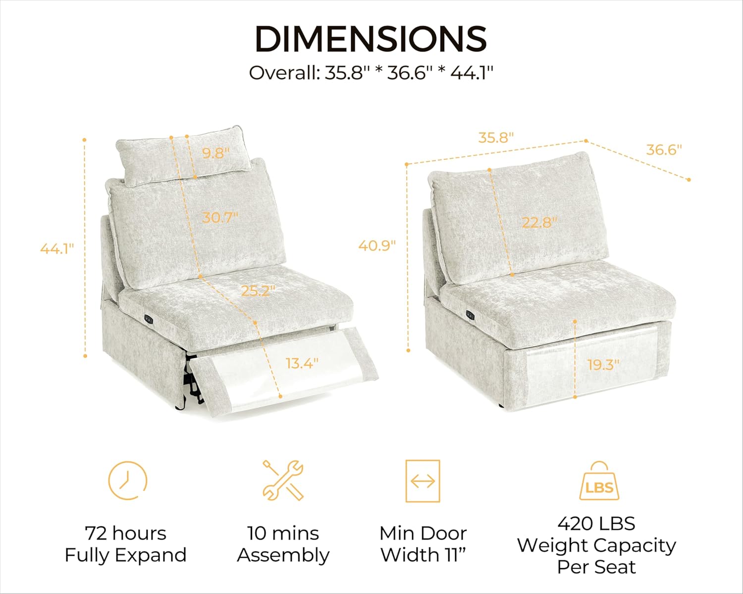 The Power Recliner Seat for Olar Oversized Modular Sectional Sofa delivers premium comfort and modern functionality, specially engineered to enhance your home theater or living space experience. Designed with tall individuals in mind, this electric reclining seat features a removable headrest that supports optimal neck alignment during extended relaxation or movie sessions. Thanks to its innovative zero-clearance reclining mechanism, the seat glides smoothly into a fully reclined position even when placed directly against a wall—no extra space required. Crafted from soft, durable chenille fabric in a crisp white finish, the recliner combines sleek aesthetics with everyday practicality.