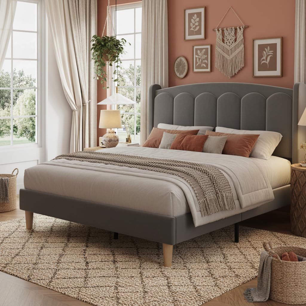 This queen bed frame with headboard is a perfect blend of modern style and everyday practicality, crafted for those who appreciate both elegance and efficiency in their bedroom furniture. The sleek velvet upholstery in a sophisticated grey tone adds a touch of luxury to any space, while the vertical channel tufted headboard enhances the overall aesthetic with its refined texture and depth. Designed as a queen platform bed frame, it eliminates the need for a box spring by offering robust wooden slat support across the entire sleeping surface—ensuring your mattress stays stable, comfortable, and well-supported night after night. Whether you’re outfitting a master suite, updating a guest room, or furnishing a small apartment, this bed delivers on both form and function without compromise.