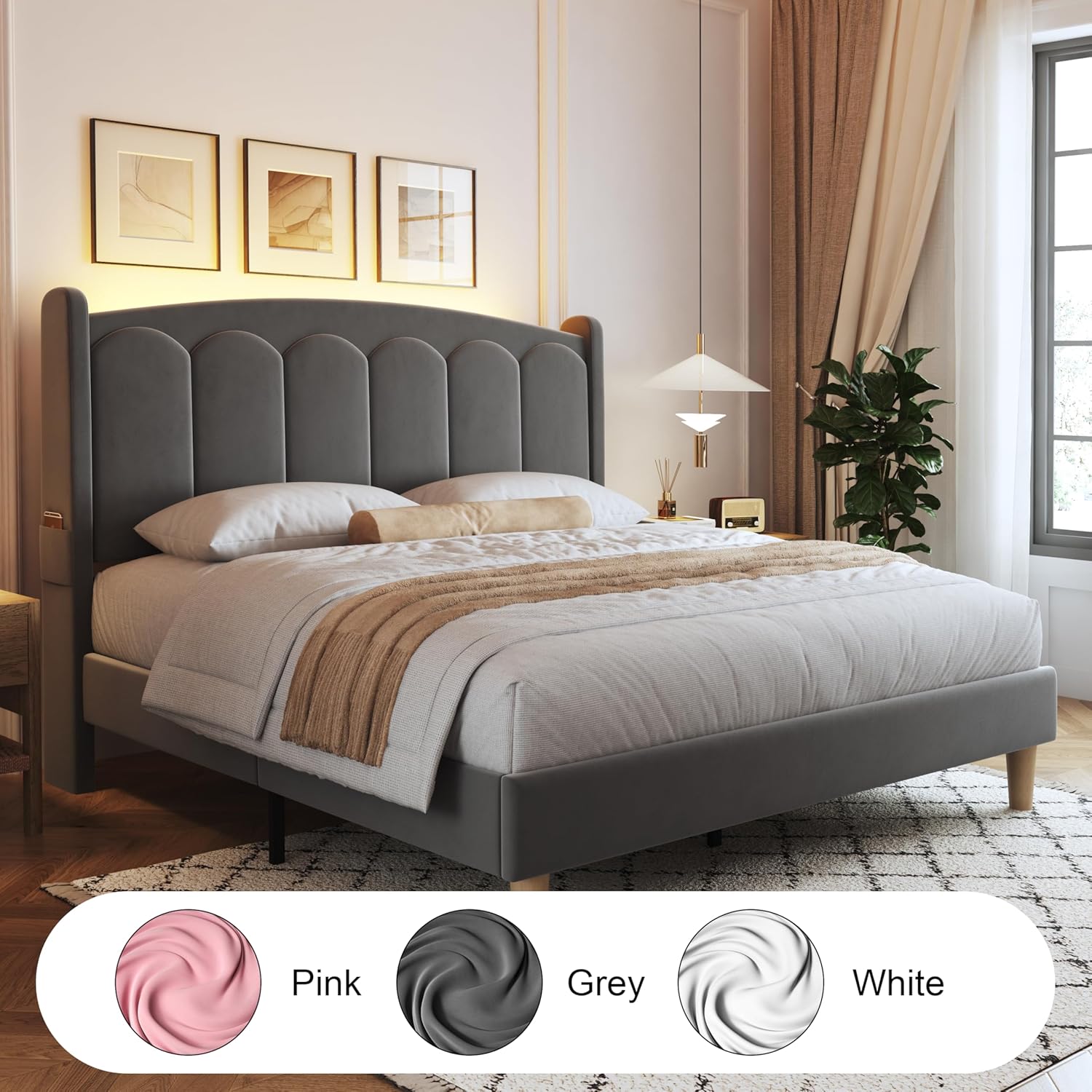This bed frame is especially well-suited for urban dwellers, couples, or anyone looking to maximize bedroom functionality without sacrificing style. The side storage pockets make it a standout choice for readers, remote users, or those who value tidiness—keeping clutter at bay right where you rest your head. Its platform design simplifies maintenance by eliminating the dust and debris that often accumulate under box springs, while the sturdy slat system ensures reliable performance year after year. The neutral grey velvet finish complements a wide range of color schemes, from minimalist monochrome to bold contemporary palettes, making it easy to integrate into existing décor. Whether used in a primary bedroom, a stylish guest space, or a compact studio apartment, this bed offers a smart balance of comfort, convenience, and chic sophistication.