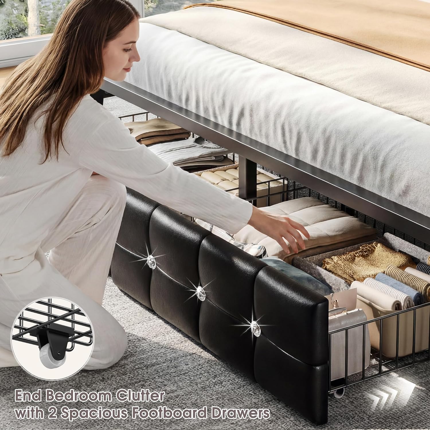 The Queen Bed Frame with Hidden Storage Headboard & 4 Drawers combines modern design, smart functionality, and durable construction into one elegant sleep solution. Crafted with a diamond-tufted upholstered leather finish in sleek black, this platform bed elevates bedroom aesthetics while delivering practical storage and convenience features. Designed for queen-sized spaces, it supports up to 1100 pounds—making it significantly stronger than standard queen beds. With built-in LED lighting, a charging station, and ample hidden storage, this bed is ideal for those seeking both style and efficiency in compact living environments.