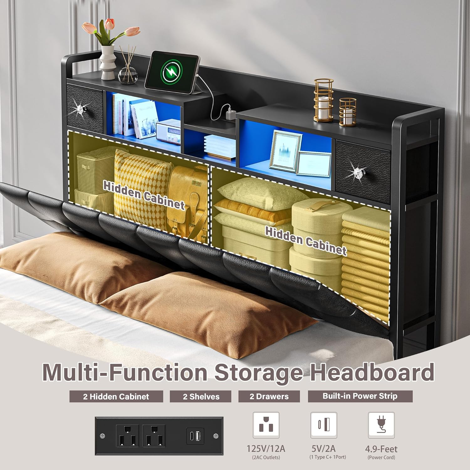 Queen Bed Frame with Hidden Storage Headboard & 4