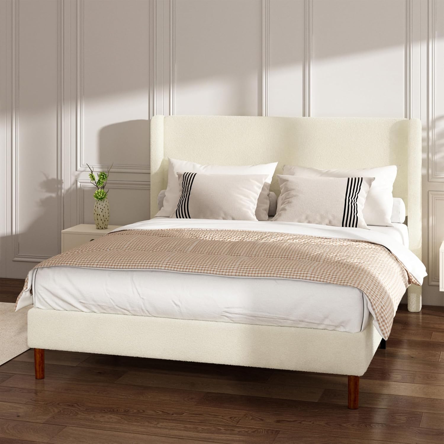 I absolutely love this bed frame! The white boucle fabric gives it such a soft, high-end look, and the wingback headboard makes the whole room feel more elevated and put together. It’s modern but still cozy, which is exactly what I was hoping for.The frame itself feels very sturdy, and the wooden slat support system is solid — no box spring needed, and no squeaking or shifting at all. It’s completely noise-free, even with movement, which was important to me. Assembly was also surprisingly straightforward and didn’t take long.My only small complaint is that the shipping box arrived with a hole in it. Thankfully everything inside was fine, but I do think a little extra protection in the packaging would help prevent potential stains or damage during transit.Overall, it’s a beautiful, well-made bed frame that looks much more expensive than it is. Highly recommend!