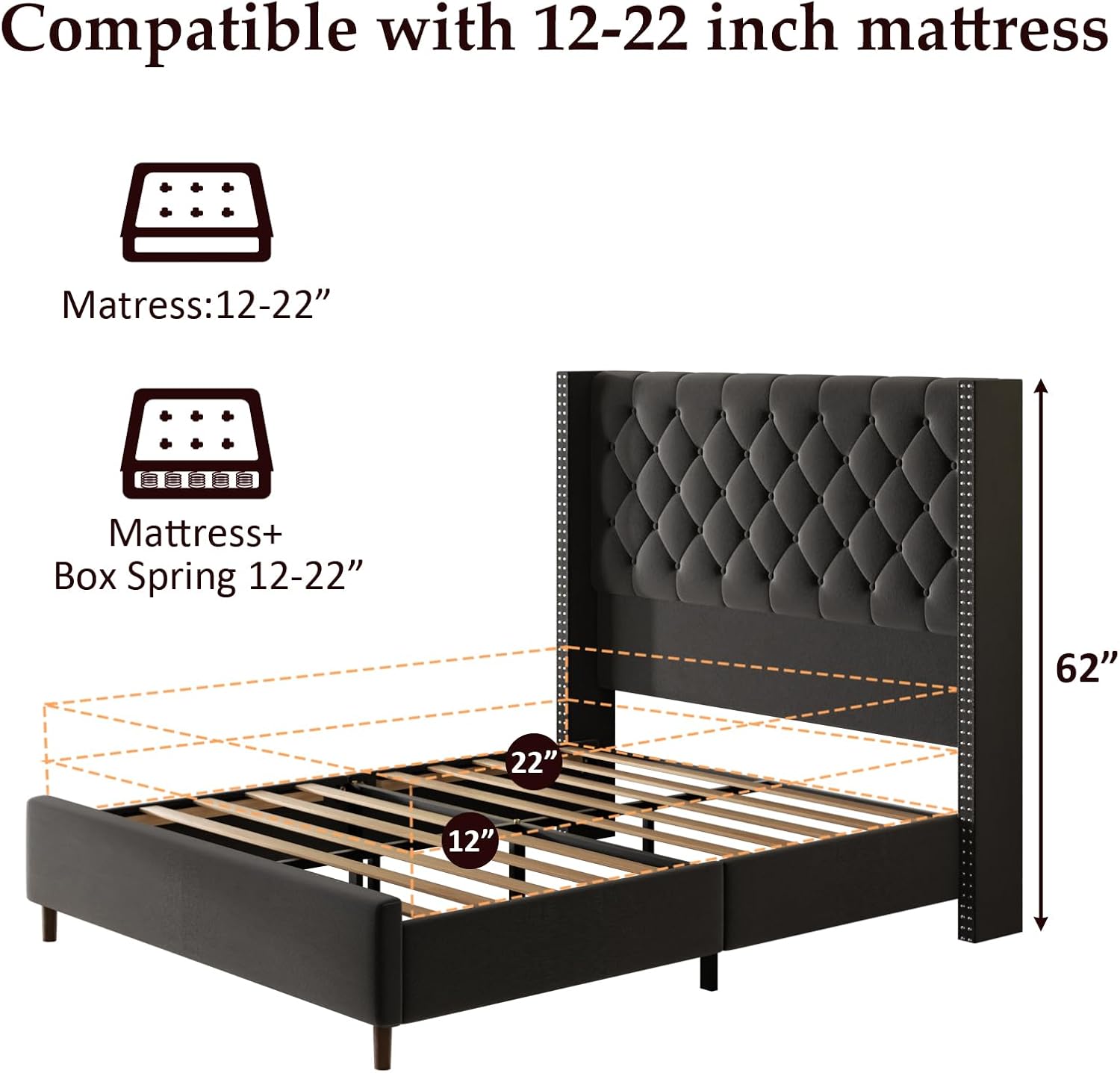 Queen Size Bed Frame with 62″ Tall Wingback Headboard,