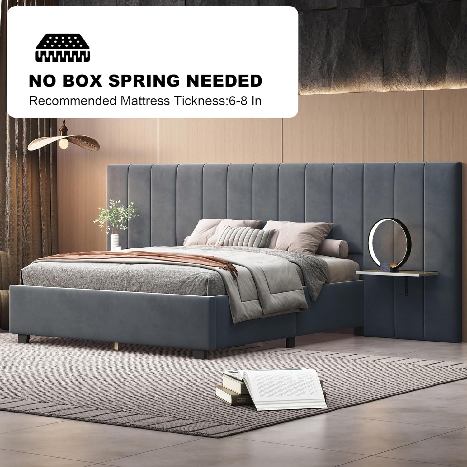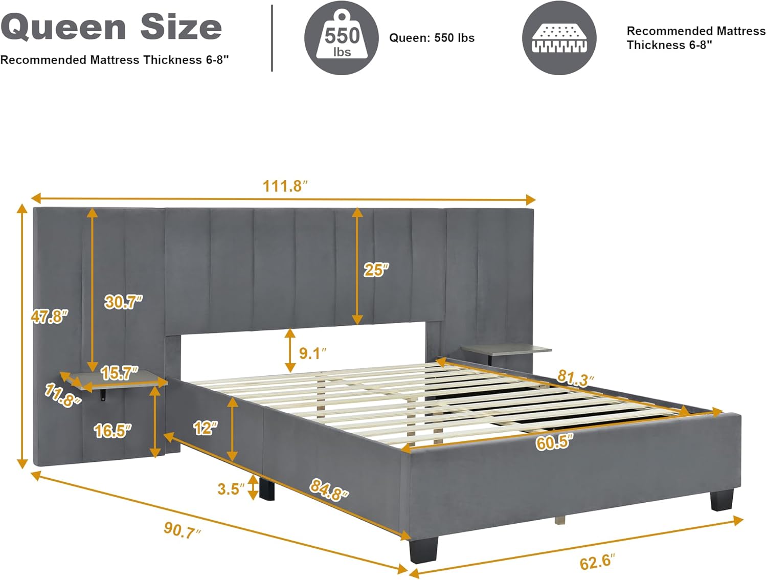 Queen Size Bed Frame with Oversized Soft Headboard and 2