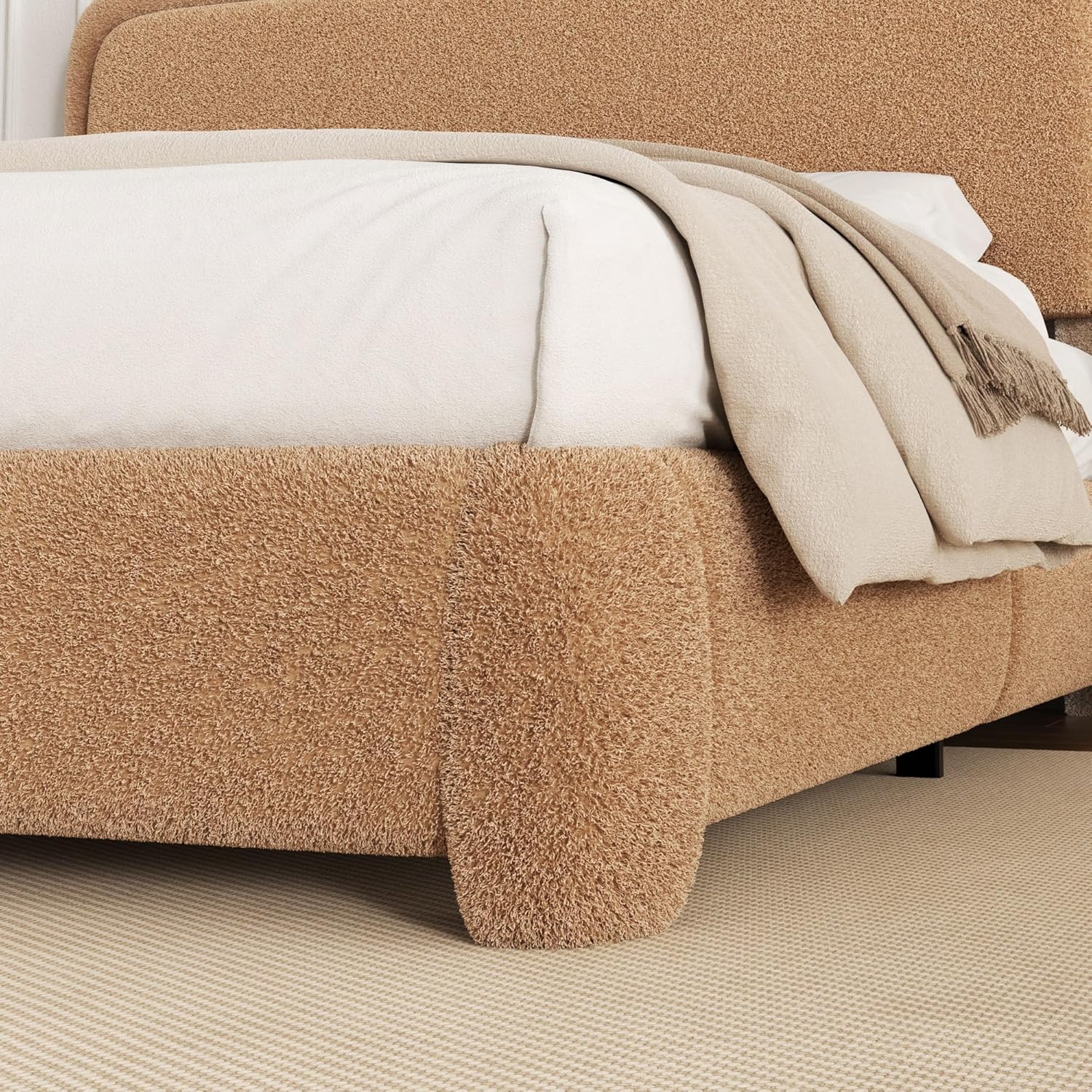 - Soft Boucle Fabric Upholstery: Wrapped in plush boucle fabric, the platform bed provides a luxurious, cloud-like texture that enhances comfort. The material not only feels soft to the touch but also adds subtle elegance to your bedroom decor, blending seamlessly into modern, minimalist, or Scandinavian-inspired spaces.