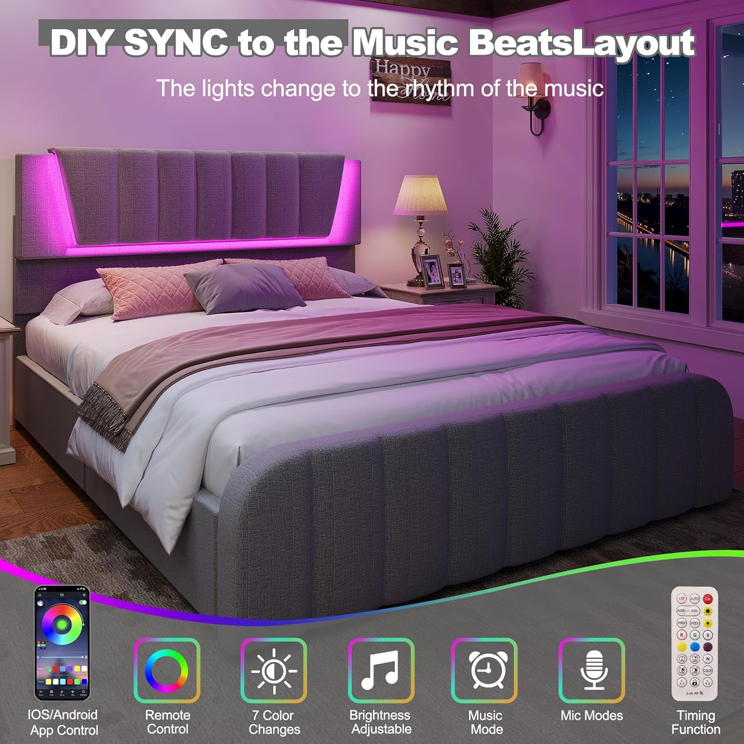 This queen size LED platform bed frame redefines modern bedroom living by blending sleek design with smart functionality. Engineered for today’s lifestyle, it features a soft-glow mood lighting system seamlessly integrated into an adjustable upholstered headboard—creating a serene atmosphere perfect for unwinding or setting the tone for restful nights. Beyond its visual appeal, the bed includes two fully concealed storage drawers, each offering 30.3 liters of space to neatly organize linens, clothing, books, and everyday items. Constructed from heavy-duty metal, the frame provides robust support without requiring a box spring, making it both durable and space-efficient. The contemporary grey linen finish adds understated elegance, while the low-profile platform enhances the clean lines of modern interiors. Ideal for small apartments, guest rooms, or master suites, this bed delivers on style, comfort, and practicality in one cohesive package.