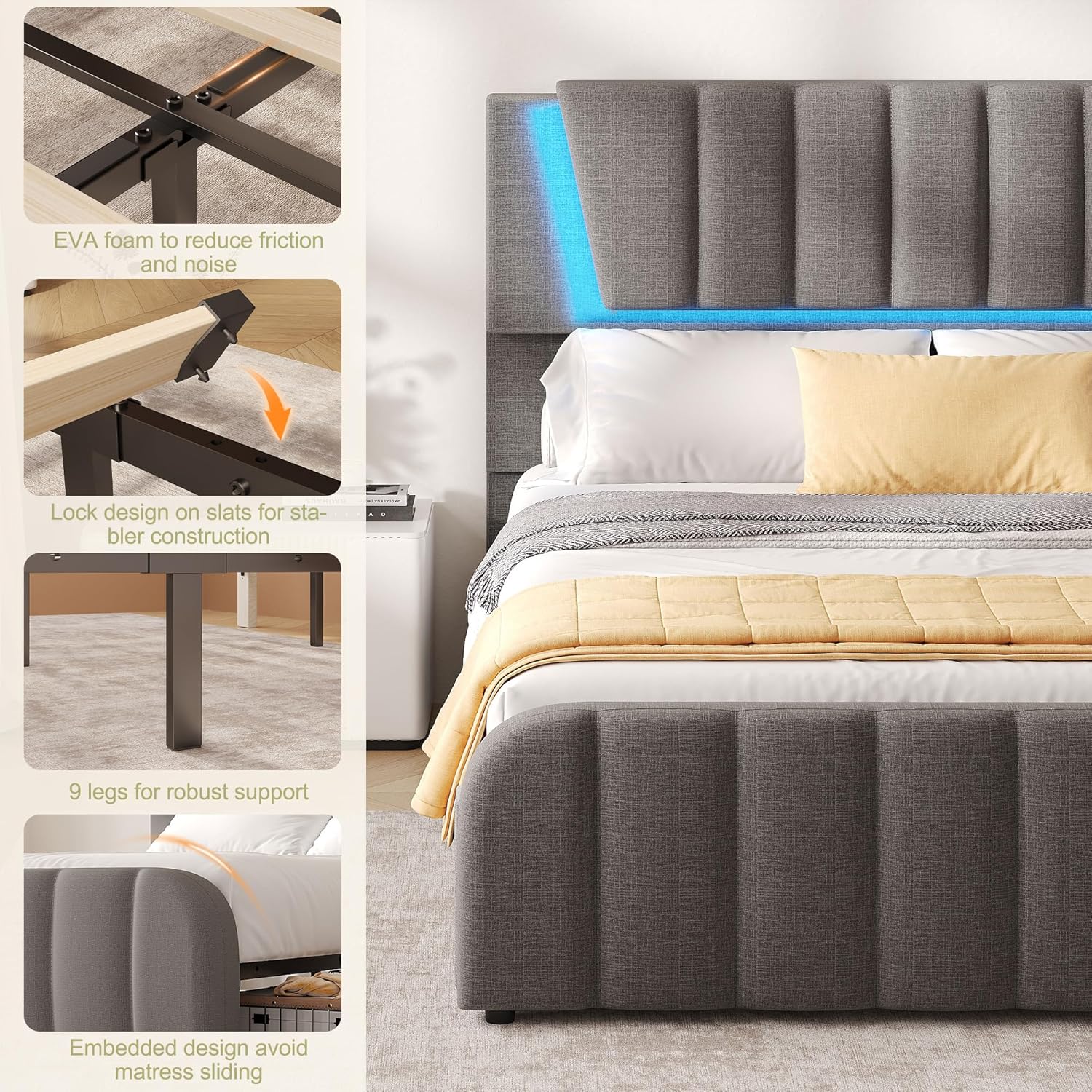 The product package includes the main bed frame with headboard, two sliding storage drawers, all necessary hardware for assembly, and instructions. Assembly is recommended upon delivery and typically takes less than two hours with basic tools. While the LED lighting operates independently, users should ensure the bed is placed near a grounded electrical outlet if remote control operation is desired. For care, gently vacuum the linen upholstery monthly and wipe spills immediately with a slightly damp cloth using mild soap if necessary. Avoid abrasive cleaners or soaking the fabric to preserve its texture and color. Always verify mattress compatibility—especially if using memory foam, latex, or hybrid types—to ensure proper fit and weight distribution across the slat system. Please refer to included assembly guide for specific torque settings and safety precautions.
