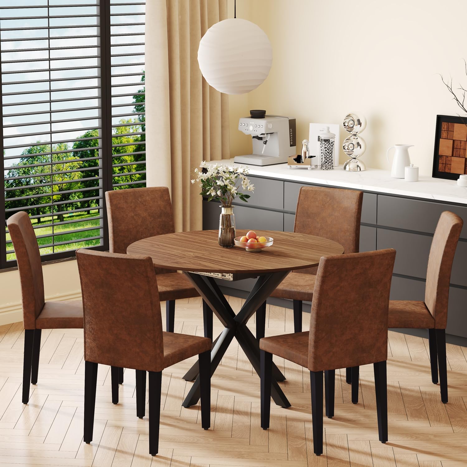 This Round Dining Table Set for 6 combines timeless mid-century modern design with practical functionality, making it an ideal centerpiece for your home’s dining or kitchen area. The set includes one extendable round table and six brown suede upholstered chairs, offering both style and comfort for everyday meals or special occasions. With its smooth faux wood grain finish that mimics natural walnut, the table brings warmth and elegance to any interior space. The compact yet versatile round shape ensures easy conversation flow, while the cross-leg base adds visual interest and structural stability.