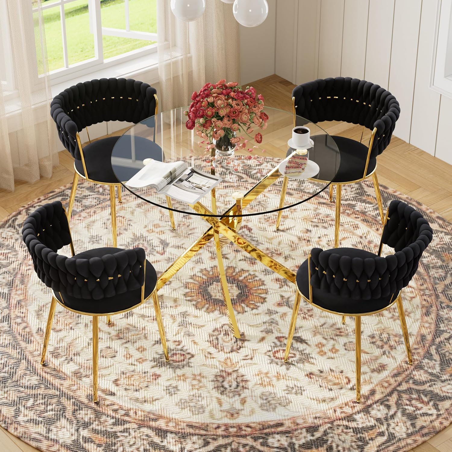 This sophisticated 5-piece dining set features a sleek round glass table paired with four luxurious black velvet chairs, designed specifically for small spaces that don’t compromise on style or comfort. The centerpiece is a 36-inch circular glass table with a striking gold-finish metal base that adds elegance without overwhelming compact areas. Combined with plush velvet seating and ergonomic support, this set creates a refined dining experience perfect for apartments, studio kitchens, or cozy breakfast nooks.