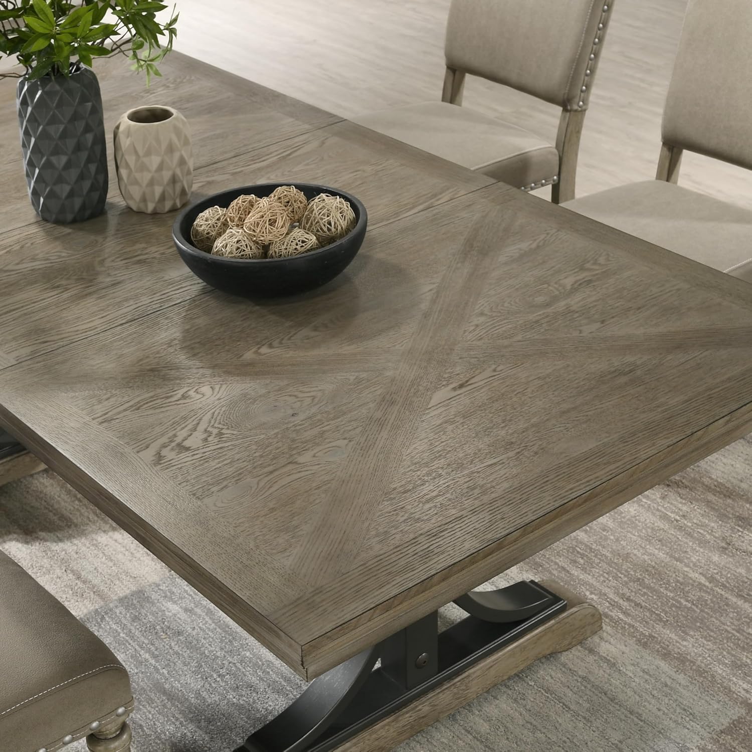 Its driftwood finish pairs beautifully with neutral color schemes, light woods, and even bold accent pieces, allowing you to integrate the set seamlessly into existing interiors. Whether placed in a formal dining room, a breakfast nook, or a combined kitchen-family area, this set delivers both comfort and visual cohesion. The nailhead bench not only provides extra seating but also serves as a stylish focal point, while the armchairs offer added support during longer meals.