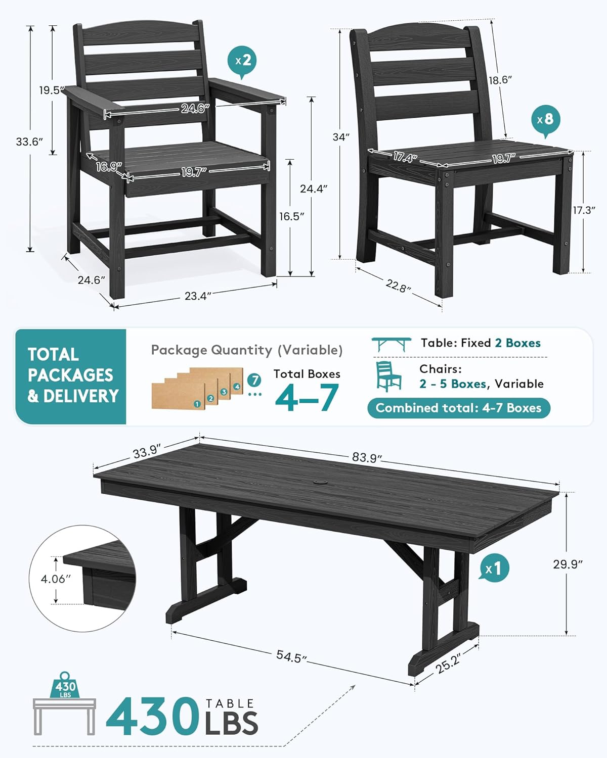 This dining set is perfect for homeowners seeking a low-maintenance yet stylish solution for outdoor entertaining. Whether hosting weekend barbecues, holiday gatherings, or quiet family meals, the spacious table accommodates up to 10 people comfortably. Its all-weather resistance makes it suitable for use throughout the seasons, from summer pool parties to autumn harvest dinners. The pet-friendly surface and smooth edges ensure peace of mind if you have furry companions nearby. Thanks to its neutral black finish and wood-grain styling, it blends seamlessly into various decor schemes—from contemporary to rustic.