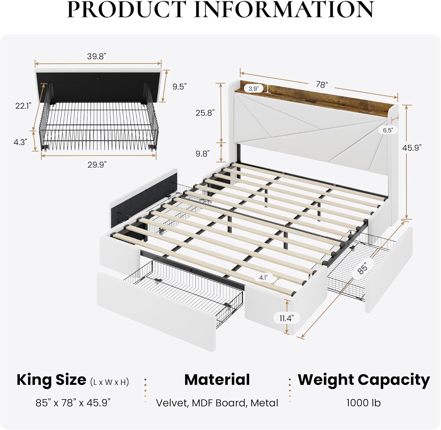 SHA CERLIN King Size Bed Frame with 3 Drawers, USB & Type-C
