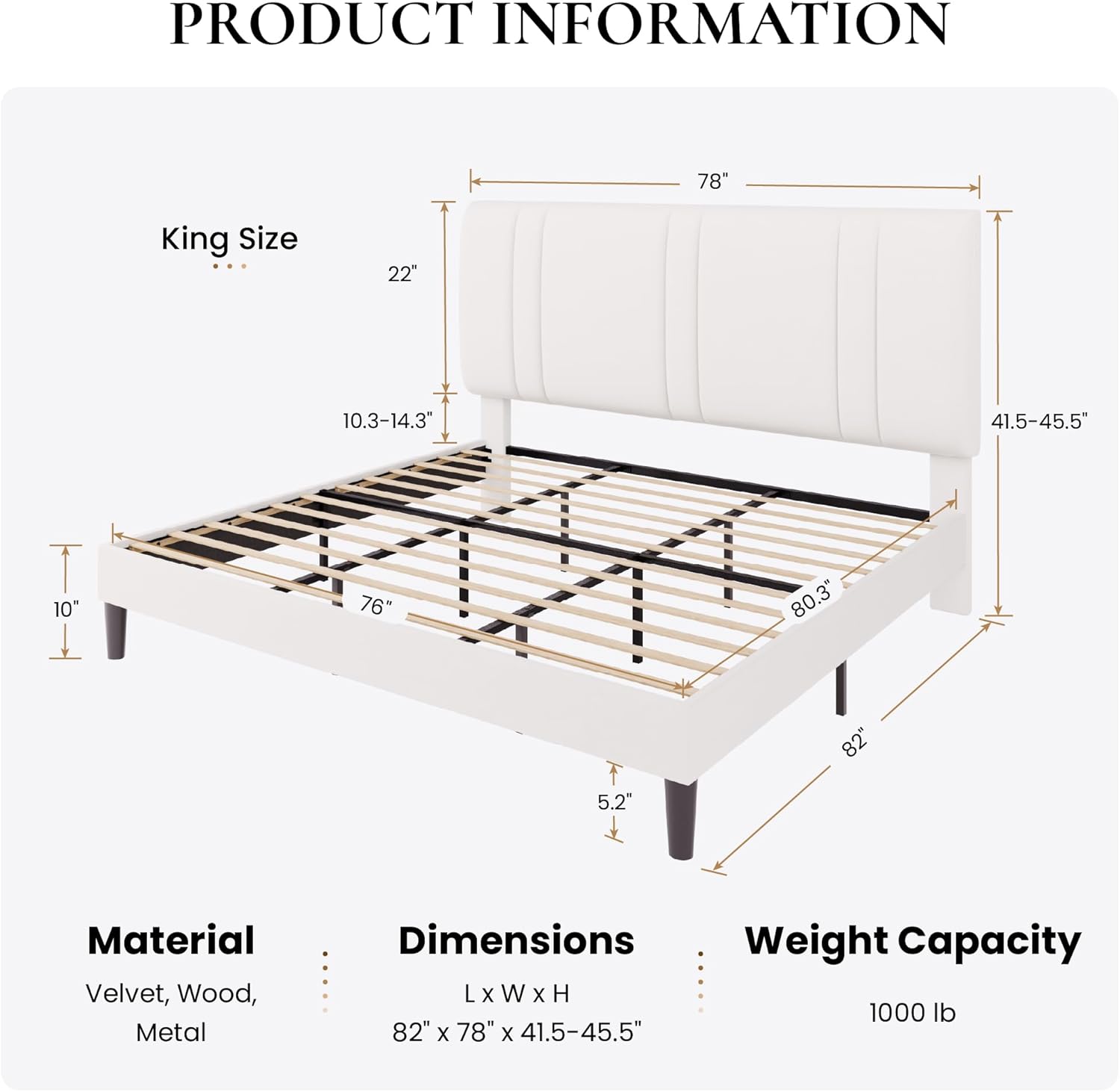 • Weight Capacity: Supports standard king-size mattresses (typically up to 150 lbs)