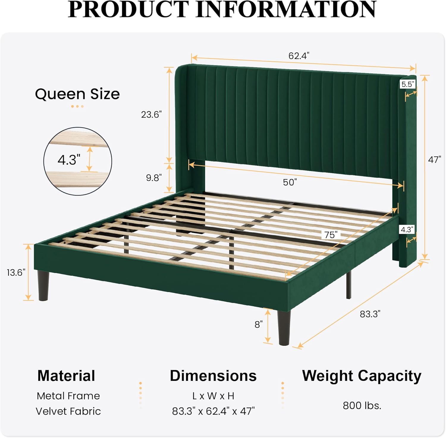 The SHA CERLIN Queen Size Velvet Bed Frame combines timeless design with modern functionality, offering a luxurious sleeping experience in a space-saving platform style. Crafted with attention to detail, this upholstered bed features a vertical channel tufted wingback headboard that adds depth and elegance to any bedroom décor. The rich velvet finish enhances the overall aesthetic while providing a soft, inviting texture underfoot. Built for durability and comfort, it supports up to 800 lbs and eliminates the need for a box spring—making it an ideal choice for both homeowners and renters seeking style without added complexity.