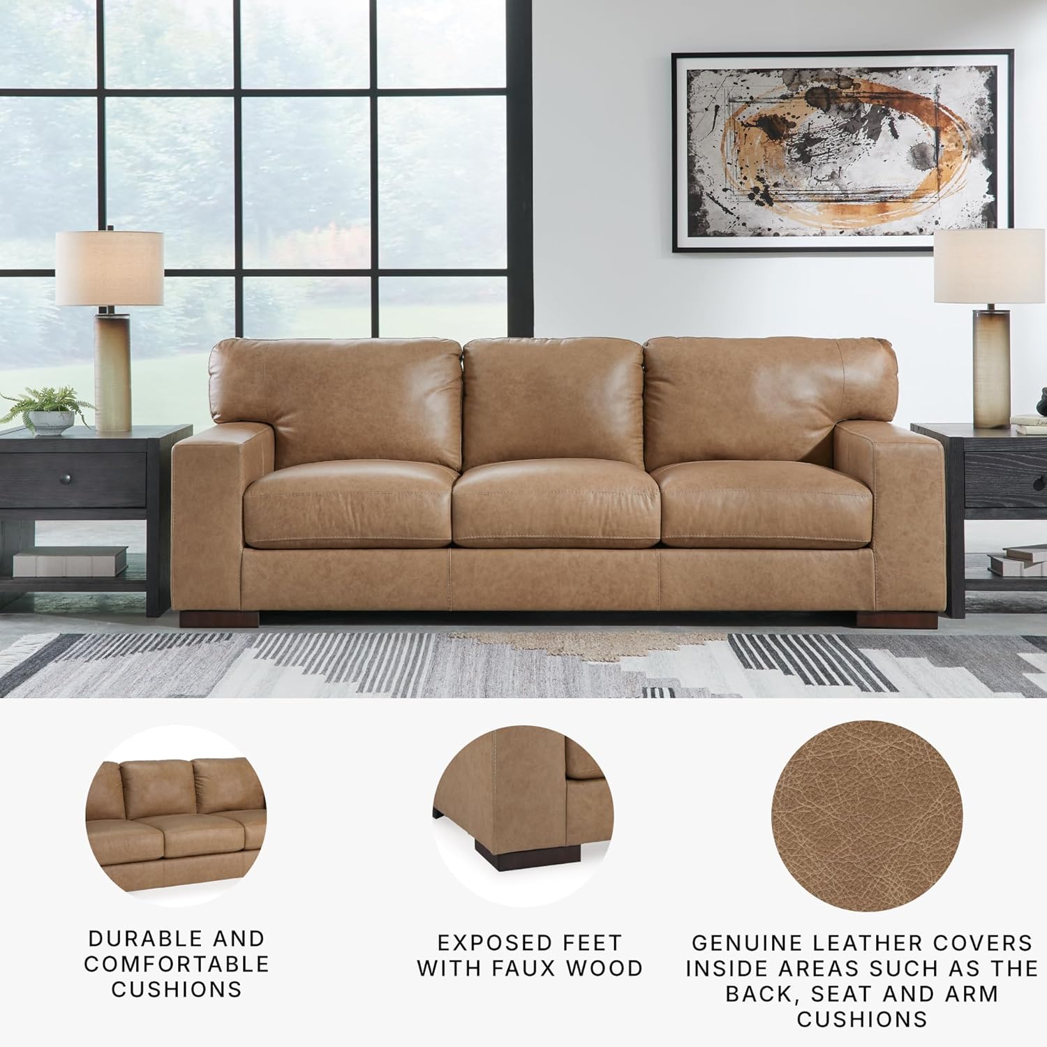 The Signature Design by Ashley Lombardia Contemporary Leather Match Sofa is a masterful blend of luxury, durability, and modern design, crafted to elevate your living space. Designed with both comfort and aesthetics in mind, this sofa features genuine leather on high-contact areas—back, seat cushions, and armrests—paired seamlessly with expertly matched faux leather for a cohesive, upscale appearance. The reinforced hardwood frame ensures long-term stability, making it ideal for everyday use in family rooms, entertainment zones, or cozy lounges. Its light brown finish adds warmth and versatility, effortlessly complementing a range of décor styles from contemporary minimalism to rustic farmhouse charm. Whether you’re hosting friends or unwinding after a long day, the Lombardia Sofa delivers reliable support and timeless style without breaking the bank.