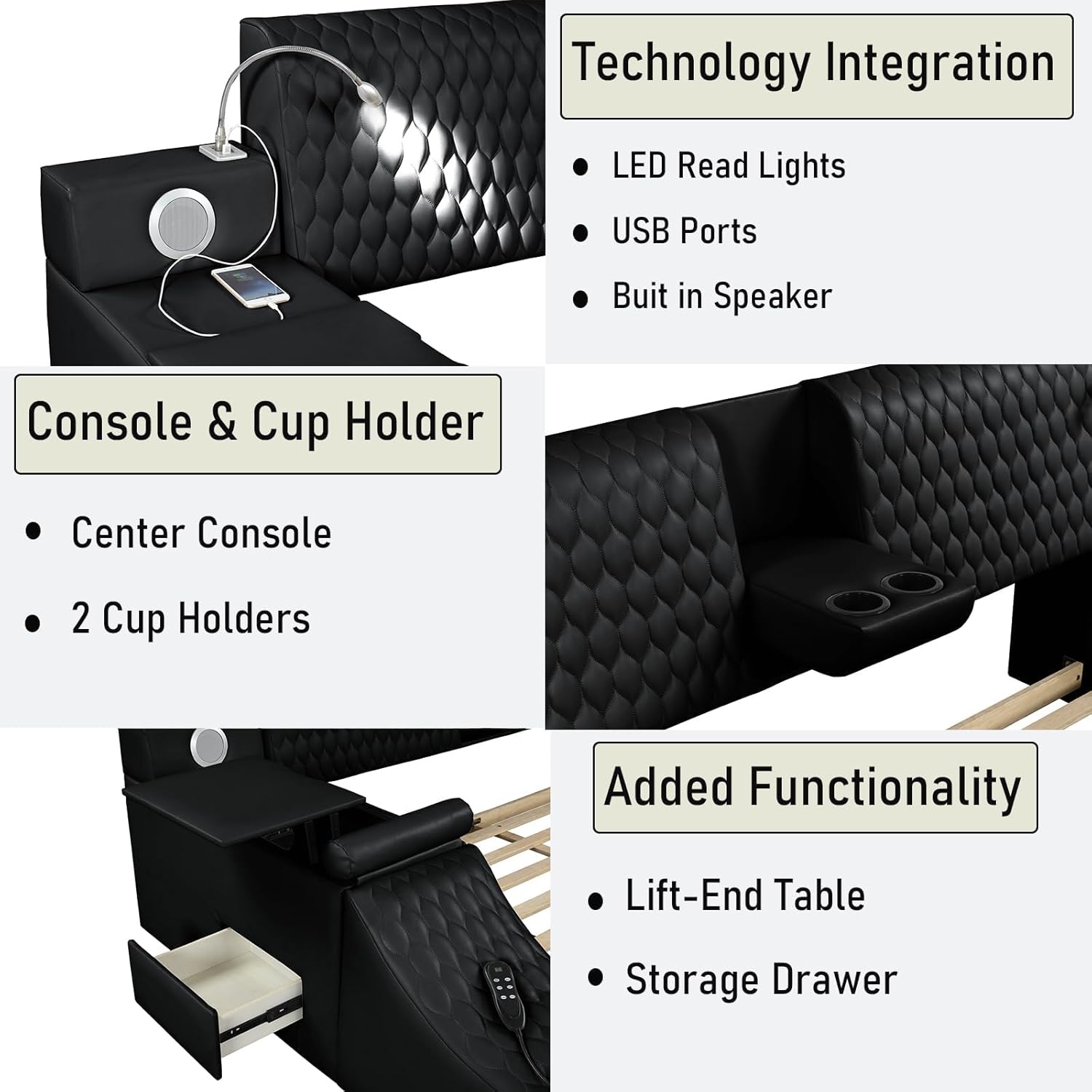 • Advanced Entertainment Console: Immerse yourself in high-quality sound with dual built-in speakers that deliver crisp audio for music, podcasts, movies, or audiobooks. The integrated entertainment console also houses ambient LED reading lights positioned perfectly beside the bed, offering soft, glare-free illumination for nighttime use without disturbing your partner.