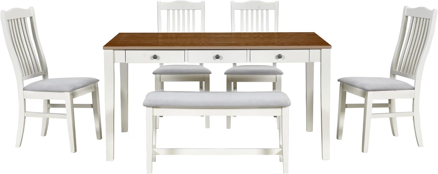 The SOFTSEA 6 Piece Farmhouse Dining Table Set brings timeless rustic charm and modern functionality to your dining space. This beautifully crafted set includes a solid wood table, four upholstered chairs, and a matching bench—perfect for families, small gatherings, or everyday meals in kitchens, dining rooms, or breakfast nooks. Designed with farmhouse aesthetics in mind, this set blends natural textures with clean lines and a warm white finish that complements both traditional and contemporary interiors. Built for durability and comfort, it offers practical features like built-in storage drawers under each chair, ensuring your dining essentials stay organized and within reach. Whether you’re hosting a casual brunch or enjoying a quiet dinner at home, this dining set delivers style, comfort, and utility in one cohesive package.
