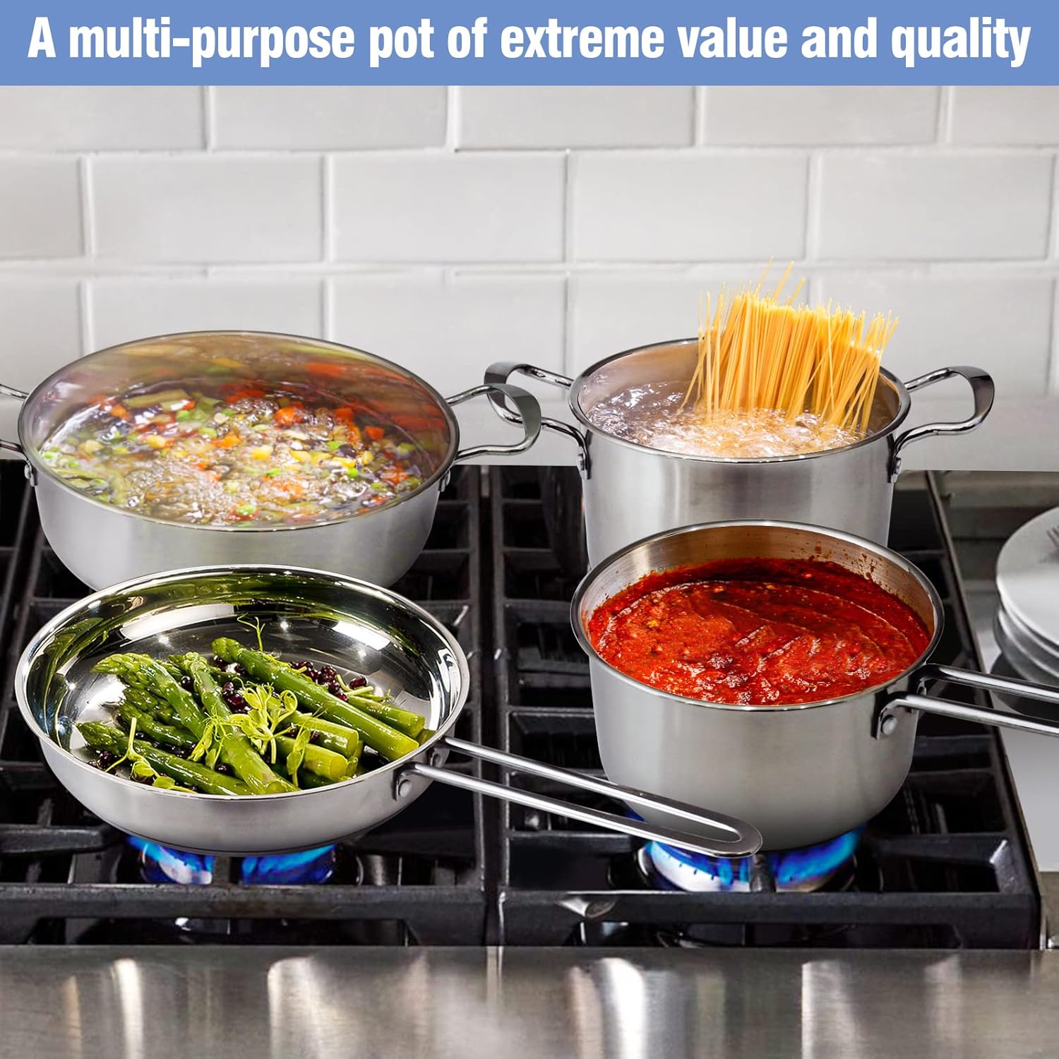 High-Quality Materials: The pots and pans feature a 3-ply premium quality stainless steel base with a thick aluminum core for fast and even heat distribution and maximum durability.even heat distribution.