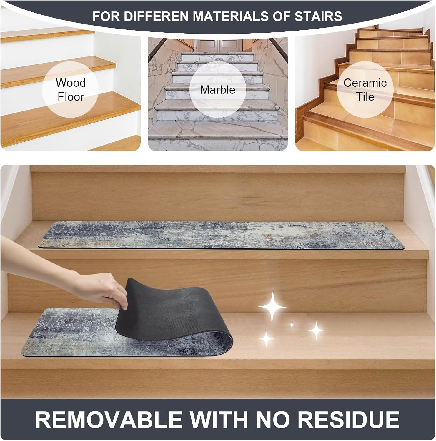 Easy Install & No Residue: Clean the floor, dry it, and place it. Without using any tape or glue, it leaves no residue after removal, protect your wooden floor. Carpet stair treads for wooden steps can be used on various floors such as wood, tile, marble.